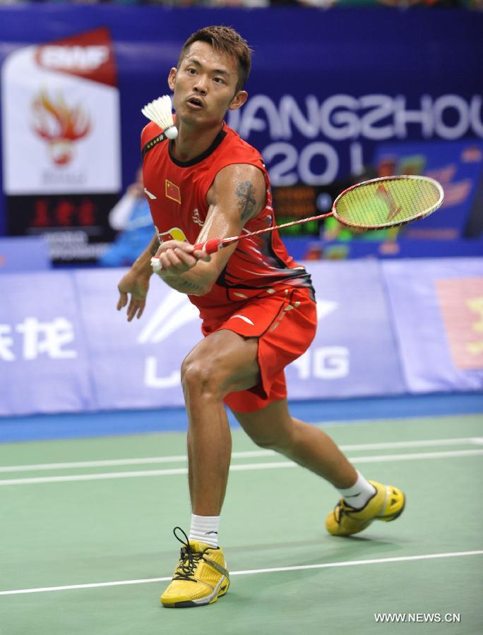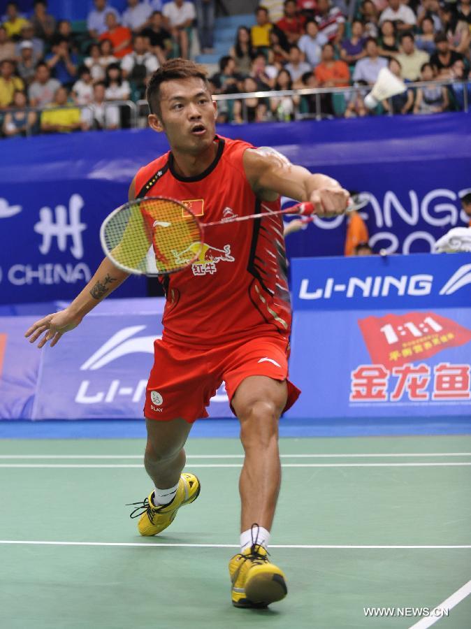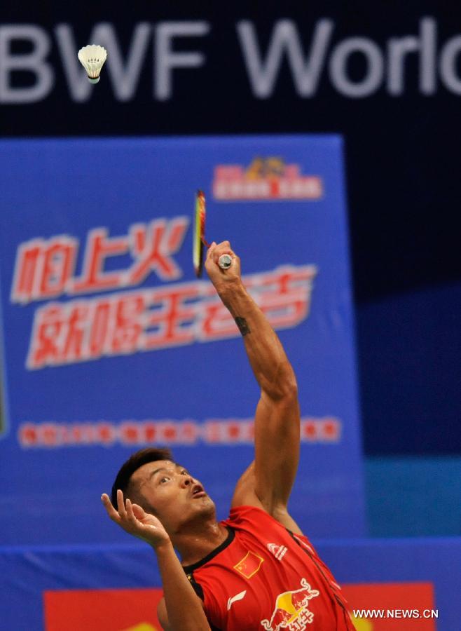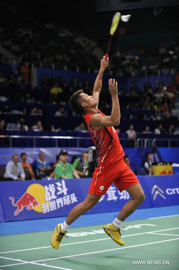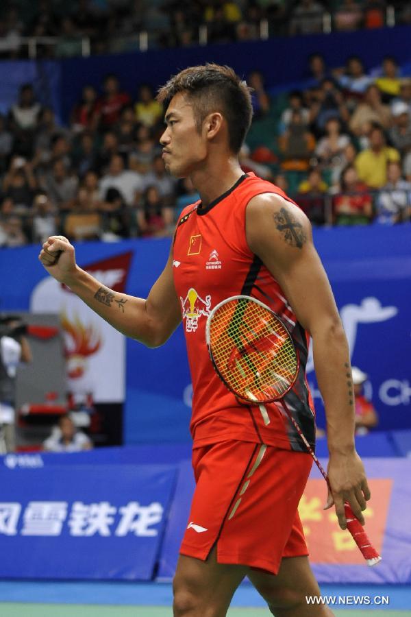 Lin Dan of China celebrates during men's single match against Eric Pang of the Netherlands at the 2013 BWF World Championships in Guangzhou, south China's Guangdong Province, Aug. 7, 2013. Lin Dan won 2-0. (Xinhua/Liang Xu)