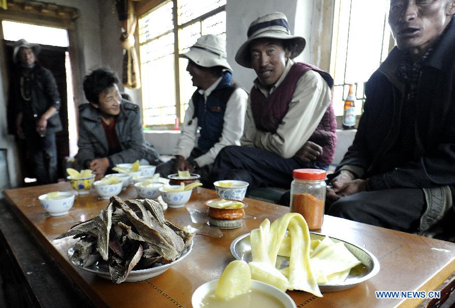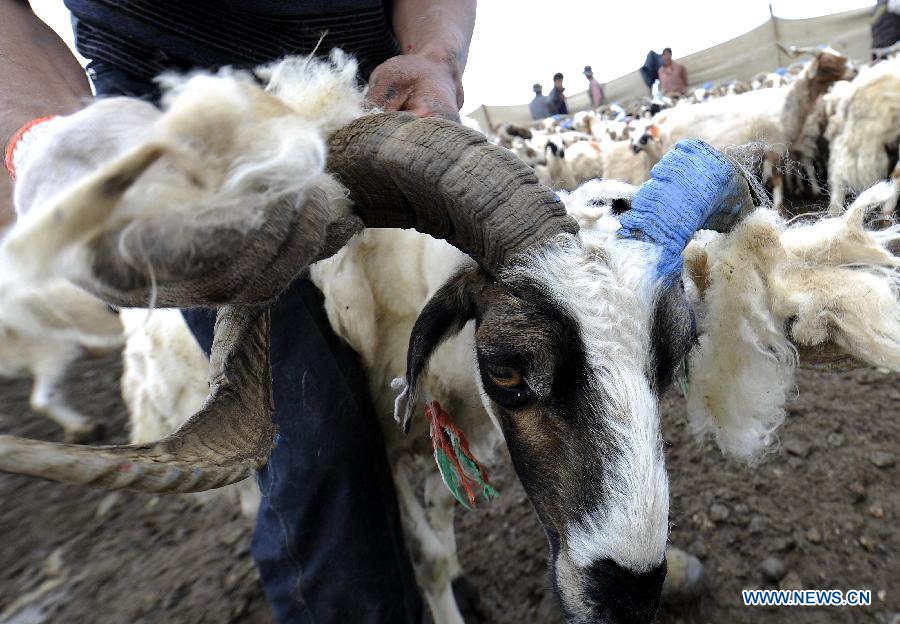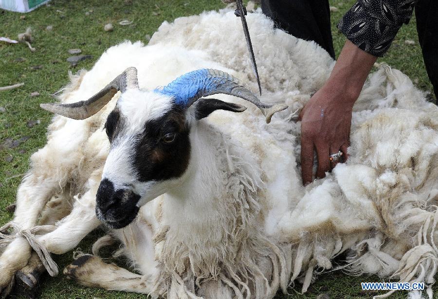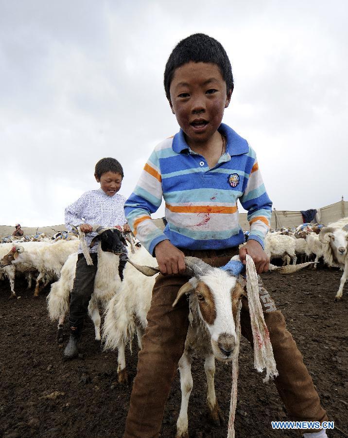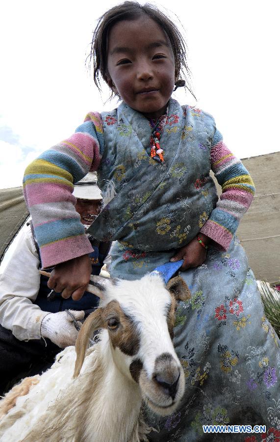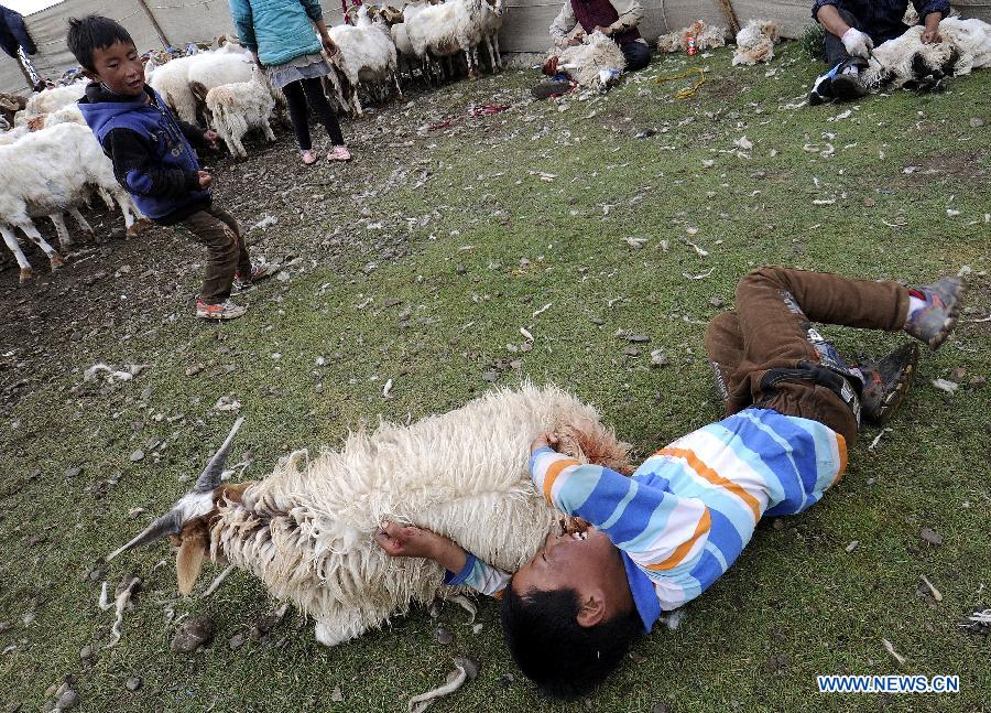 A girl of Tibetan ethnic group helps an adult shear a sheep in Damxung County, southwest China's Tibet Autonomous Region, Aug. 7, 2013. It is the harvesting period of wool for herdsman in Tibet. (Xinhua/Chogo)