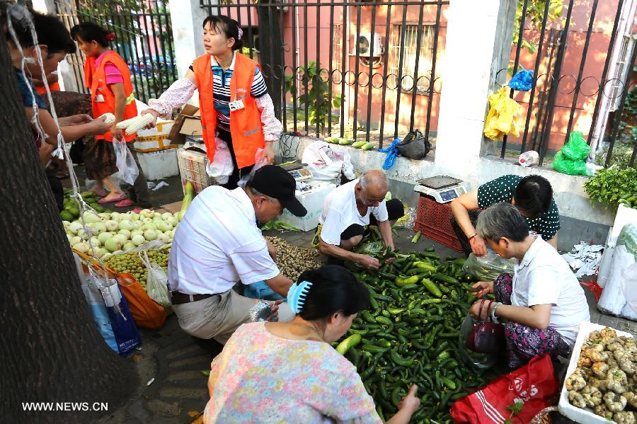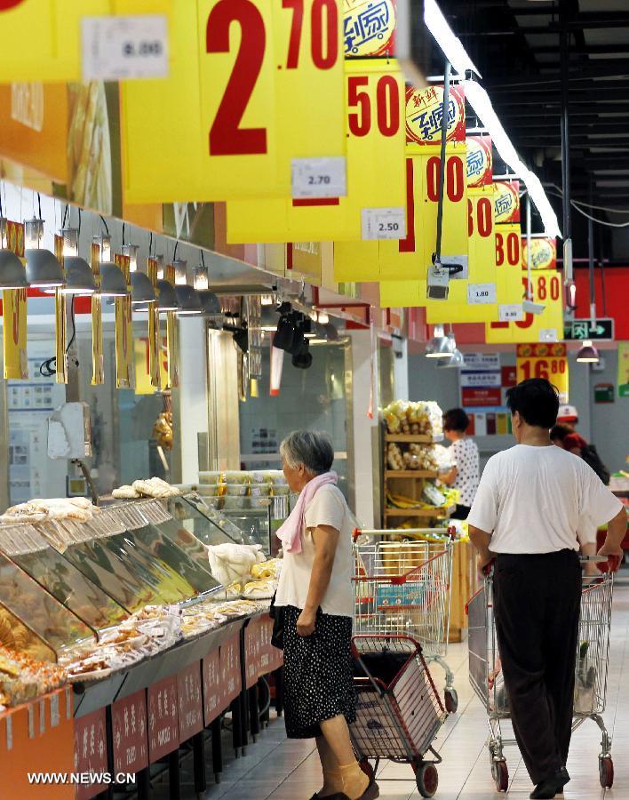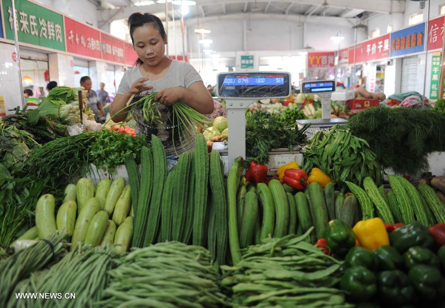 Citizens select vegetables at a market in Shanghai, east China, Aug. 9, 2013. China's consumer price index (CPI), a main gauge of inflation, grew 2.7 percent year on year in July, staying flat from the figure for June, the National Bureau of Statistics (NBS) announced on Friday. (Xinhua/Yang Shichao)
