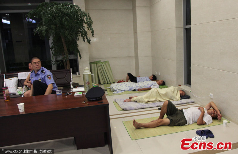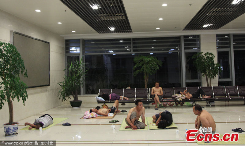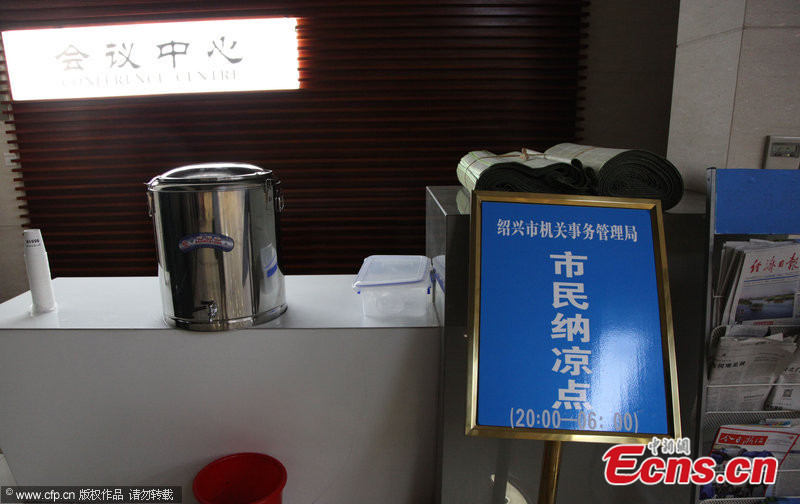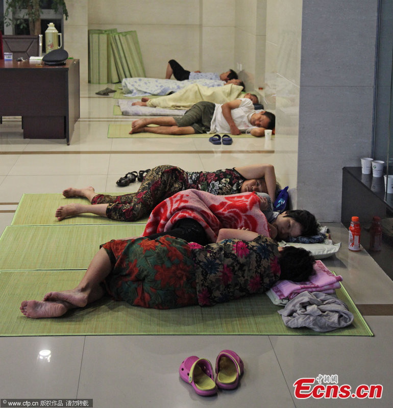 Photo taken on August 10 shows migrant workers cool off themselves at the local municipal government's conference center in Shaoxing City of east China's Zhejiang Province. A record-breaking heat wave hit the city this summer with the highest of 42 degrees Celsius. Since July 31 the Shaoxing municipal government opened its conference center for local residents to escape the heat. [Photo/CFP]