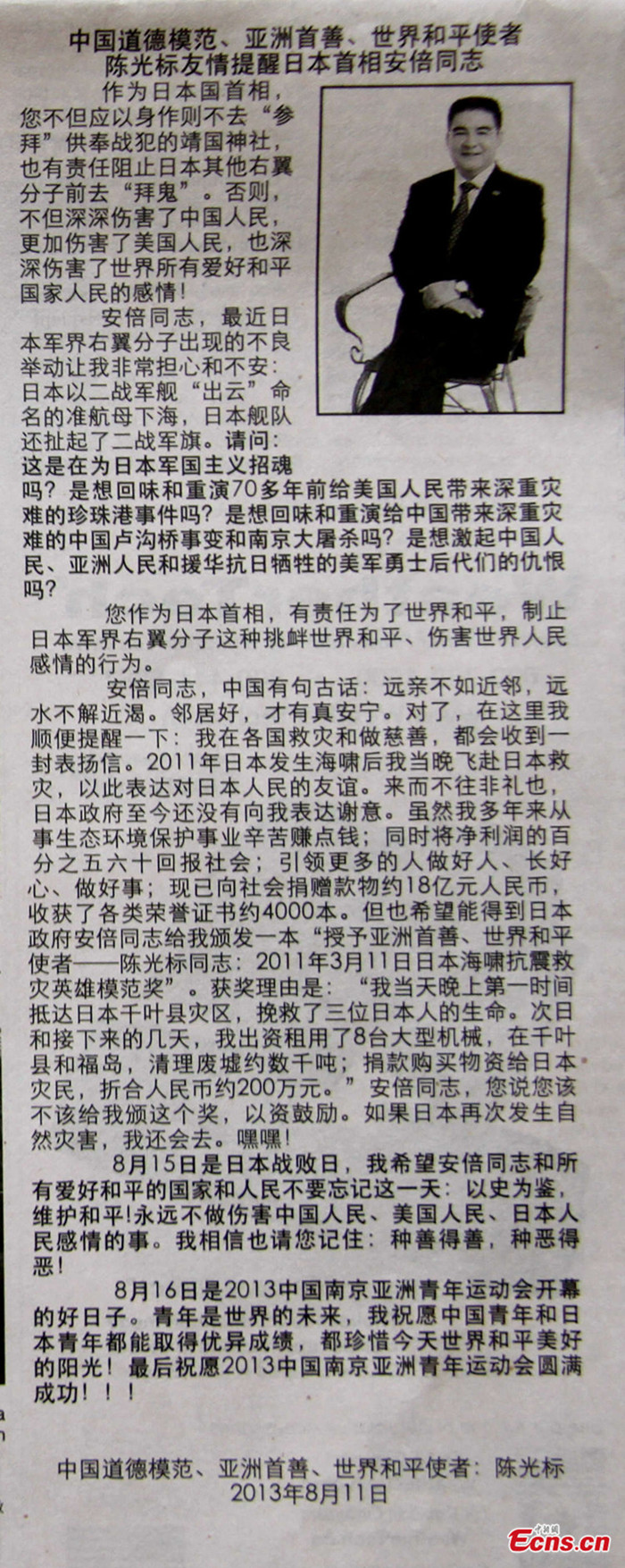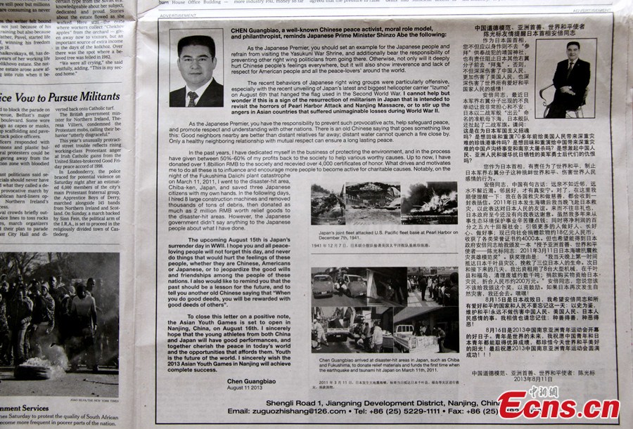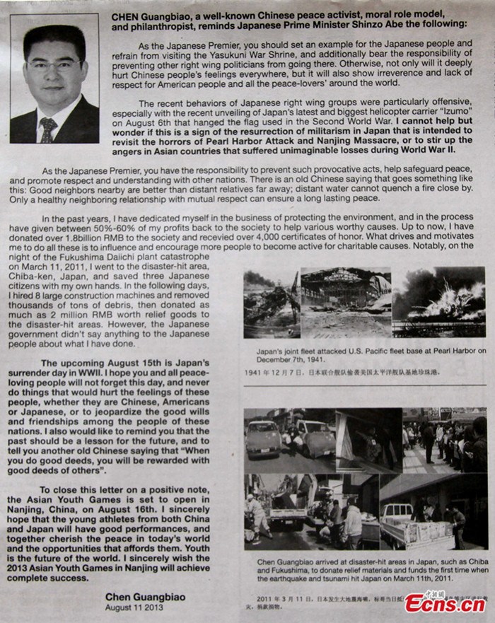 Chinese entrepreneur and philanthropist Chen Guangbiao published a half-page advertisement in the New York Times on August 11, 2013, reminding Japanese Prime Minister Shinzo Abe to refrain from visiting the Yasukuni Shrine. Chen also put an ad on the newspaper last August, declaring Diaoyu Island as Chinese. [Photo: CNS / Li Yang]