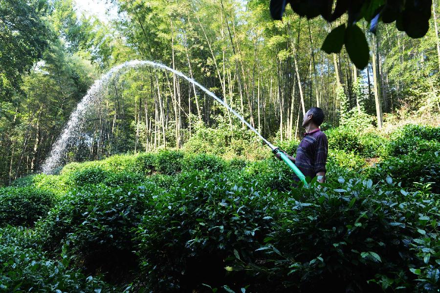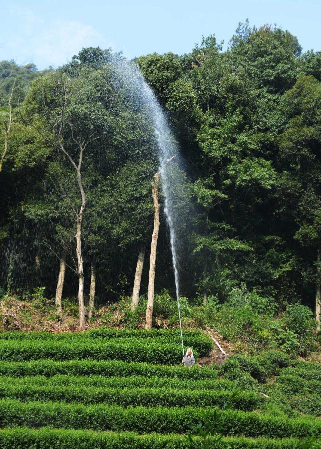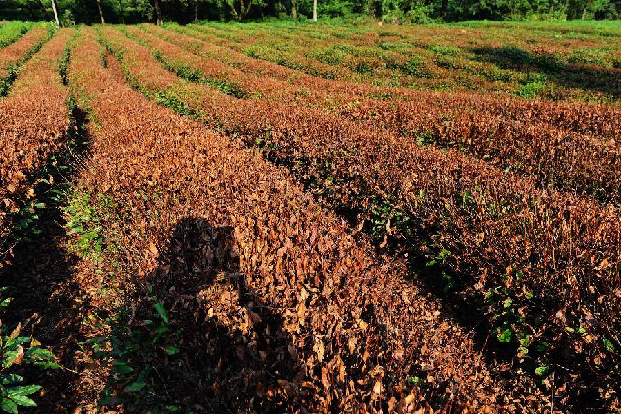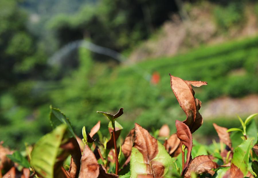 Withered tea plants are seen at a Longjing tea protection area in Hangzhou City, capital of east China's Zhejiang Province, Aug. 12, 2013. More than 40 percent tea plants in the Longjing tea protection areas in Hangzhou died of the continuous scorching weather in recent days.(Xinhua/Long Wei)