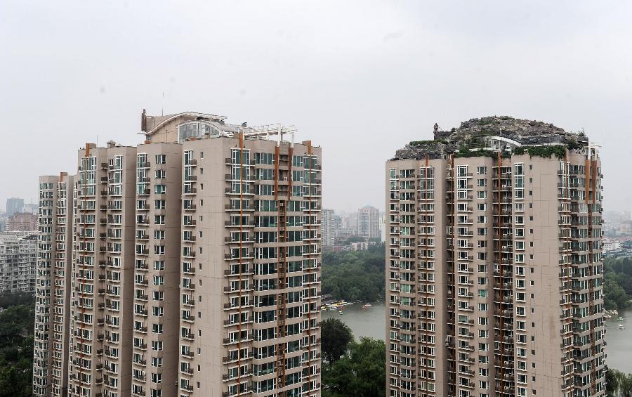 Photo taken on Aug. 12, 2013 shows a residential building with a rocky style villa on its roof, in Haidian District of Beijing, capital of China. A resident in the building has spent years to build a huge villa on top of a 26-storey building in Beijing. His neighbors have complained about this oddity covering over 1,000 square meters, fearing its weight may cause structural collapse. Local bureau of city administration attempted to investigate the allegedly illegal construction, but the owner hasn't shown up so far. (Xinhua/Luo Xiaoguang)