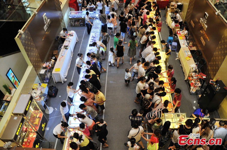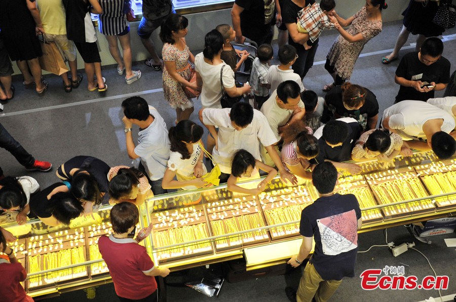 A photo taken on August 12, 2013 shows that citizens swarm into a retail store to buy gold in Southeast China's Fuzhou city ahead of Qixi festival. [Photo: CNS/ Lv Ming]