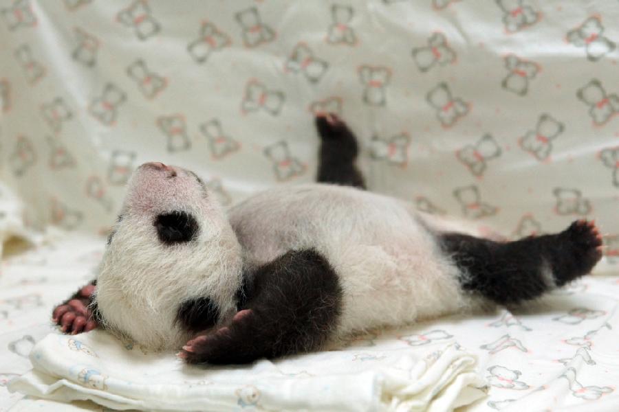 Photo taken on Aug. 8, 2013 shows a giant panda cub nicknamed "Yuan Zai" at the Taipei Zoo in Taipei, southeast China's Taiwan. The cub, born on July 6, is the first baby of a pair of giant pandas, namely "Tuan Tuan" and "Yuan Yuan", who were given as a goodwill gift to Taiwan by the Chinese mainland. (Xinhua/Taipei Zoo)