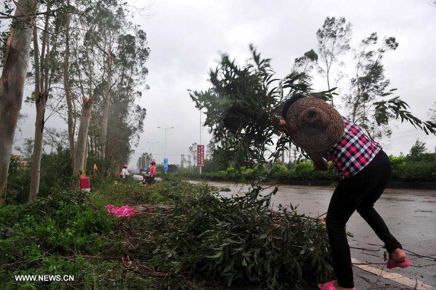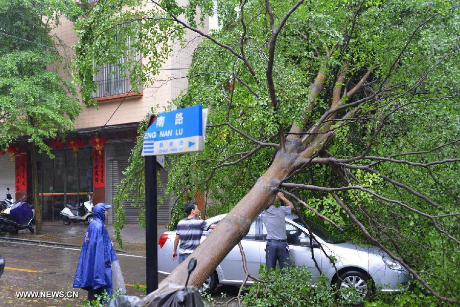 A tree is blown down by strong wind in Yangjiang City, south China's Guangdong Province, Aug. 14, 2013. Typhoon Utor, the 11th typhoon hitting China this year, landed at 3:50 p.m. in a township in Yangxi county in the city of Yangjiang in western Guangdong, packing strong winds of 151.2 km per hour at the storm center. (Xinhua/Liu Zaiyang)