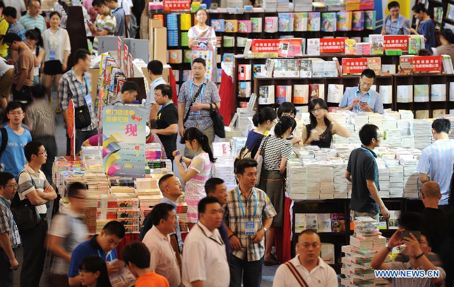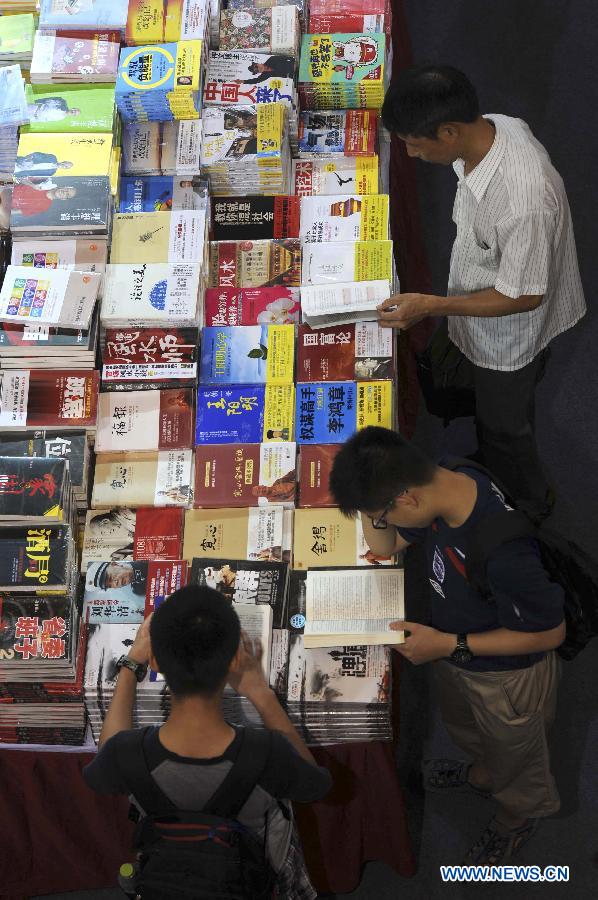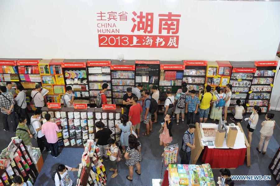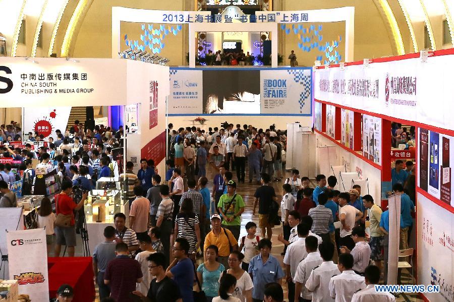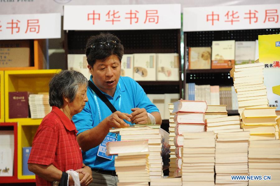 A staff member recommend books to a visitor during the 2013 Shanghai Book Fair in east China's Shanghai, Aug. 14, 2013. The seven-day book fair kicked off on Wednesday. (Xinhua/Lai Xinlin)
