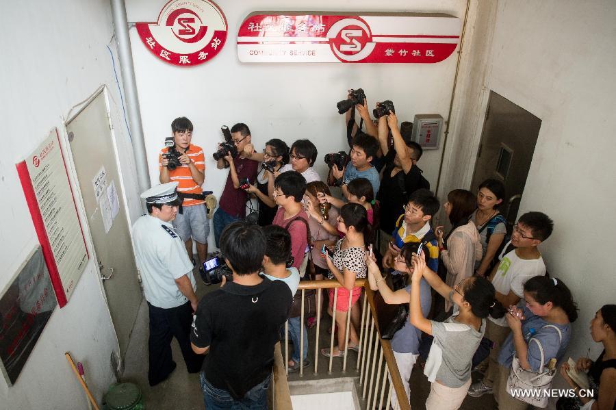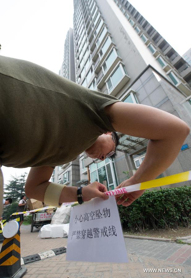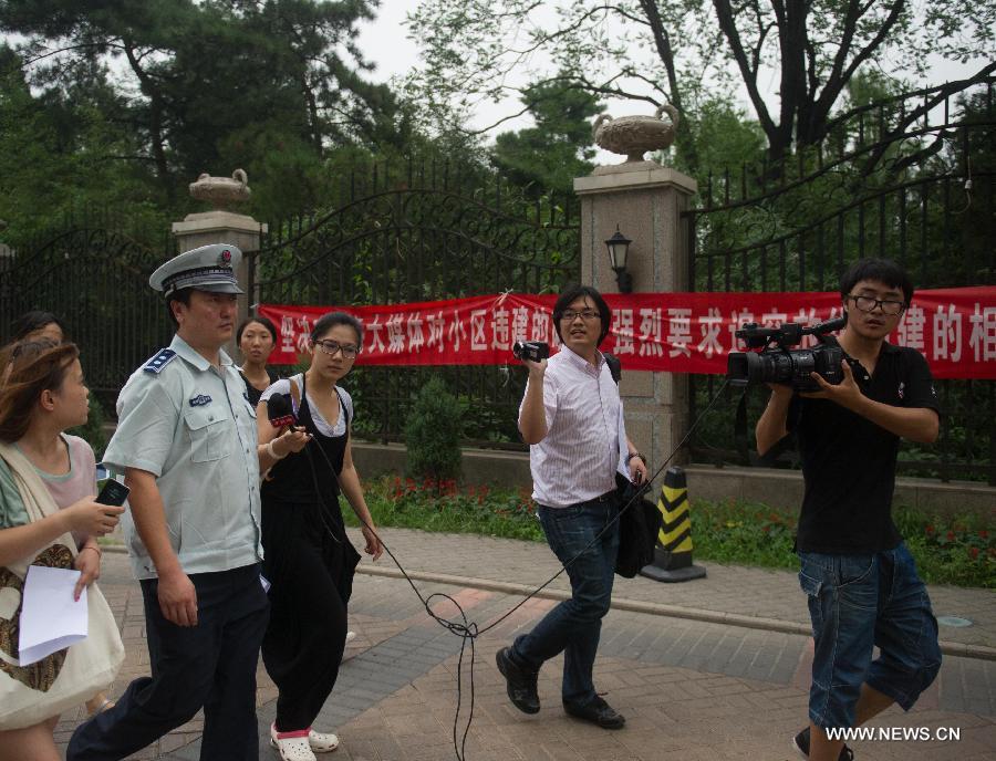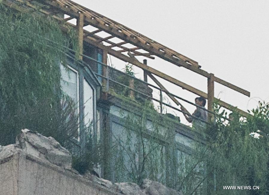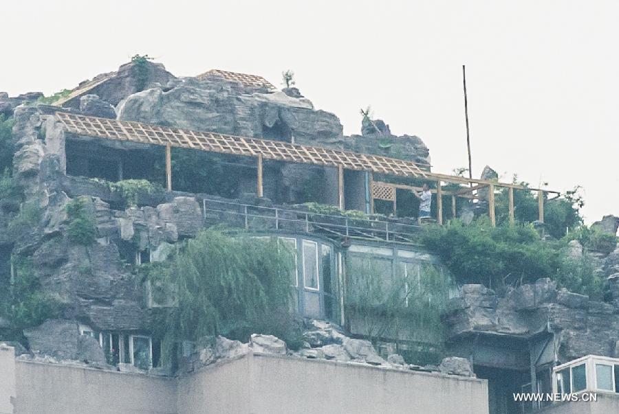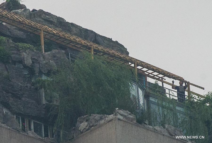 Workers dismantle a rocky style villa on the roof of a residential building, in Haidian District of Beijing, capital of China, Aug. 15, 2013. The bizarre rooftop villa, building illegally atop a 26-story apartment block in downtown Beijing, began to be dismantled Thursday. (Xinhua/Luo Xiaoguang)