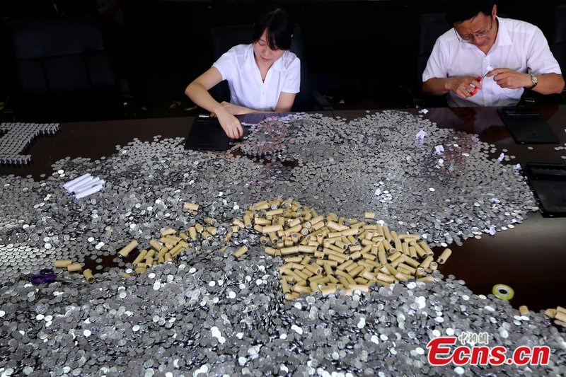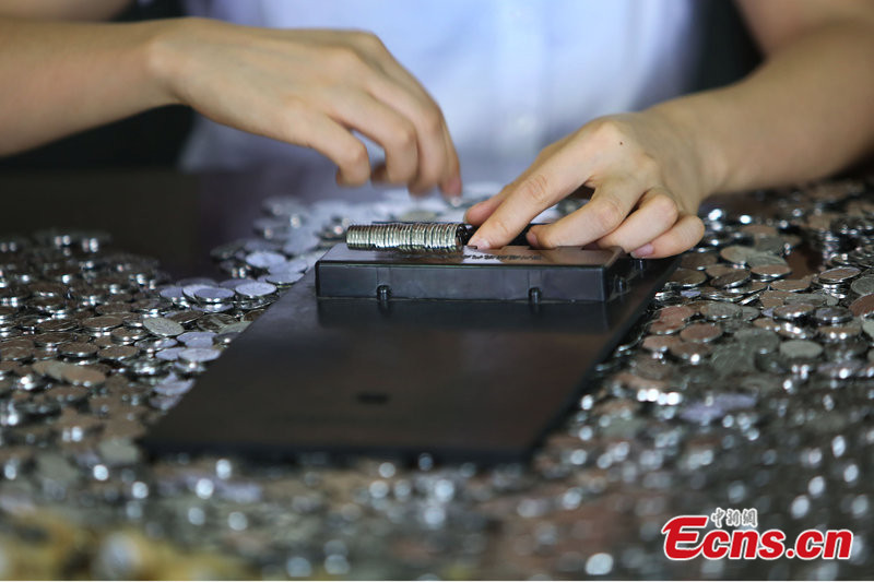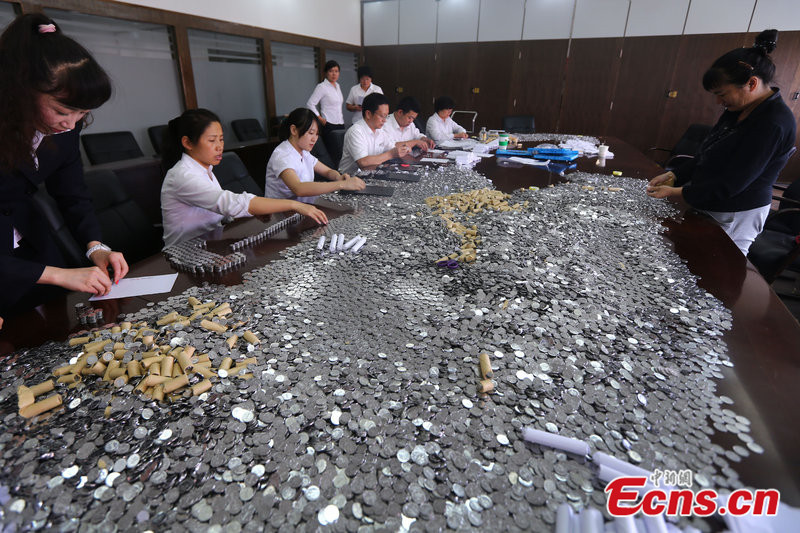 Bank staff is counting coins for a customer, who brought eight bags of one-jiao coins to the bank branch of Industrial and Commercial Bank of China in Kunming City of Yunnan province on August 15, 2013. Eighteen bank clerks just counted coins valued more than 5,000 yuan from 9 a.m. to 6 p.m.. According the customer Wu, there are a total of 10,000 yuan, which are all one-jiao coins (One jiao is equal to one-tenth of a yuan). They are compensation payments she and her husband received after winning a lawsuit over disputes. [Photo/CFP]