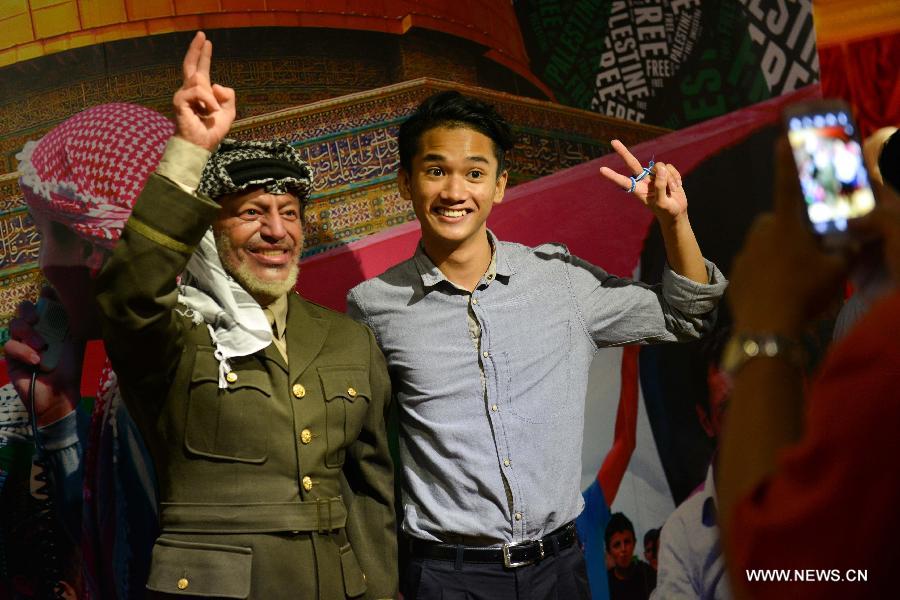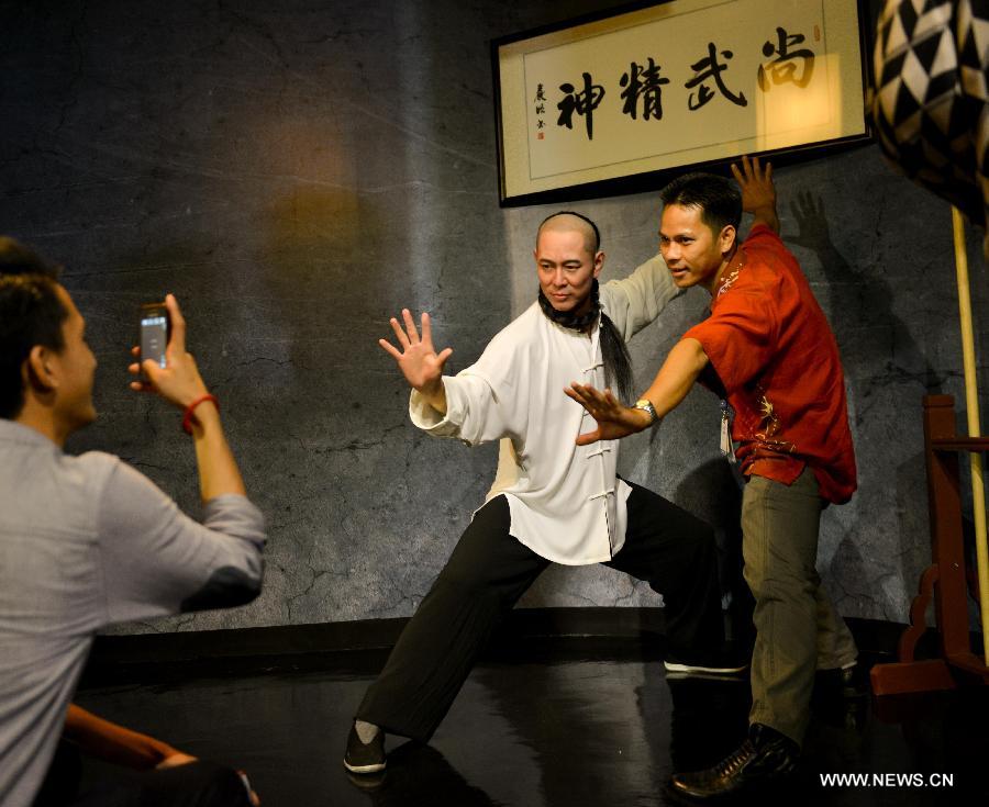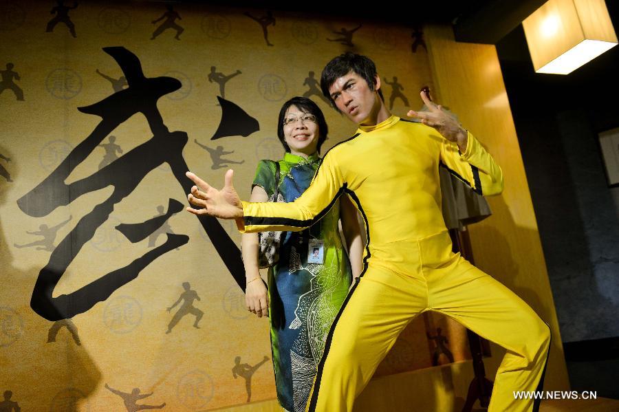 A visitor poses with the wax figure of actor Bruce Lee at the first wax museum in Selangor State, Malaysia, Aug. 15, 2013. The first wax museum in Malaysia opened here on Thursday. (Xinhua/Chong Voon Chung)