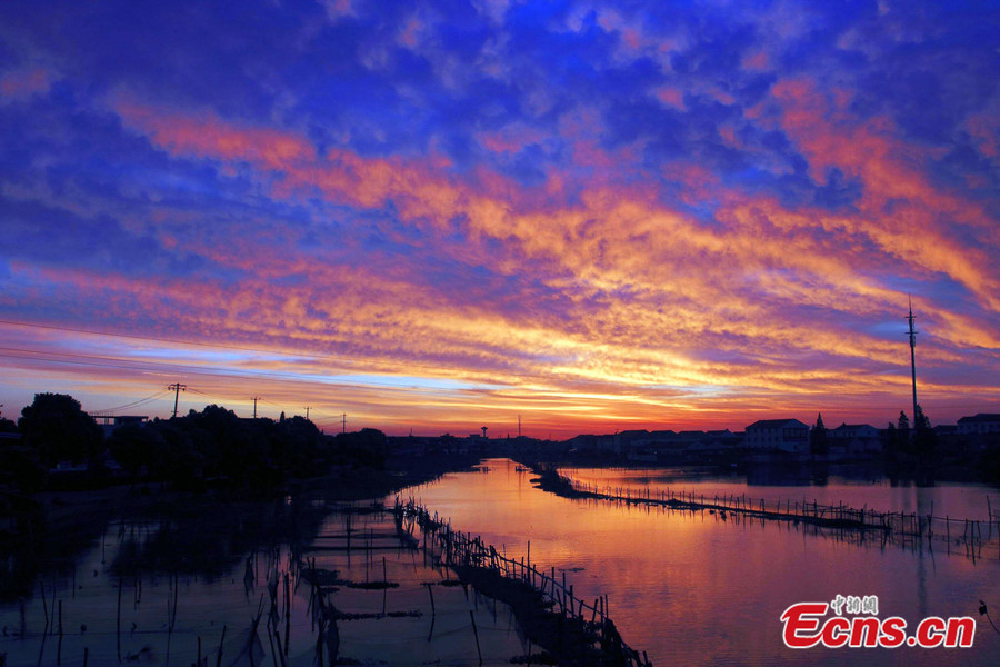 Photo shows flaming clouds seen on Friday mornng in Shaoxing City of east China's Zhejiang province. [CNSPHOTO]