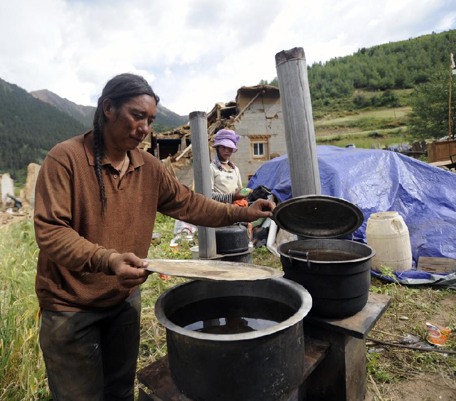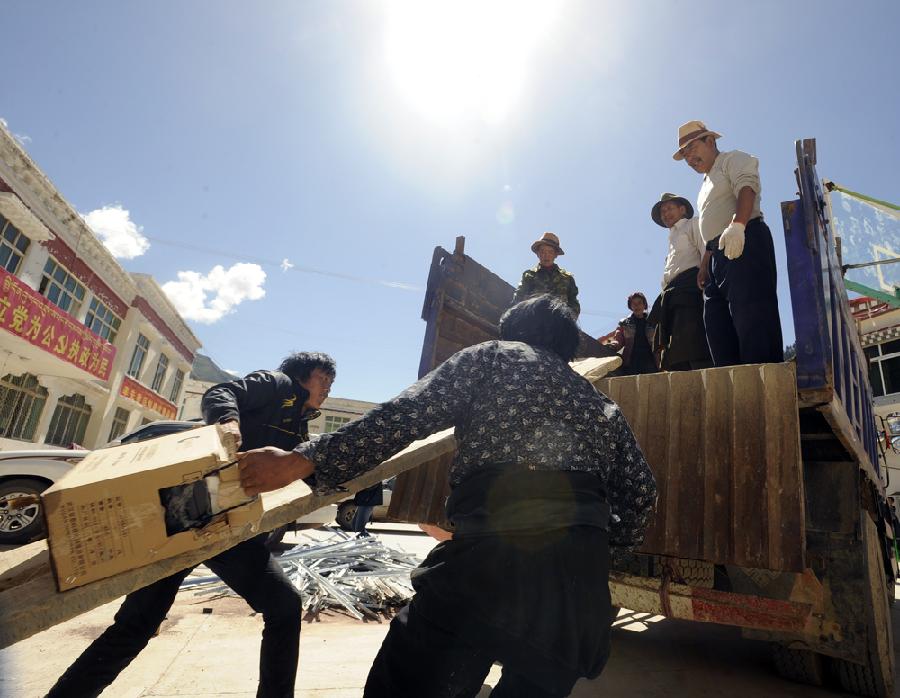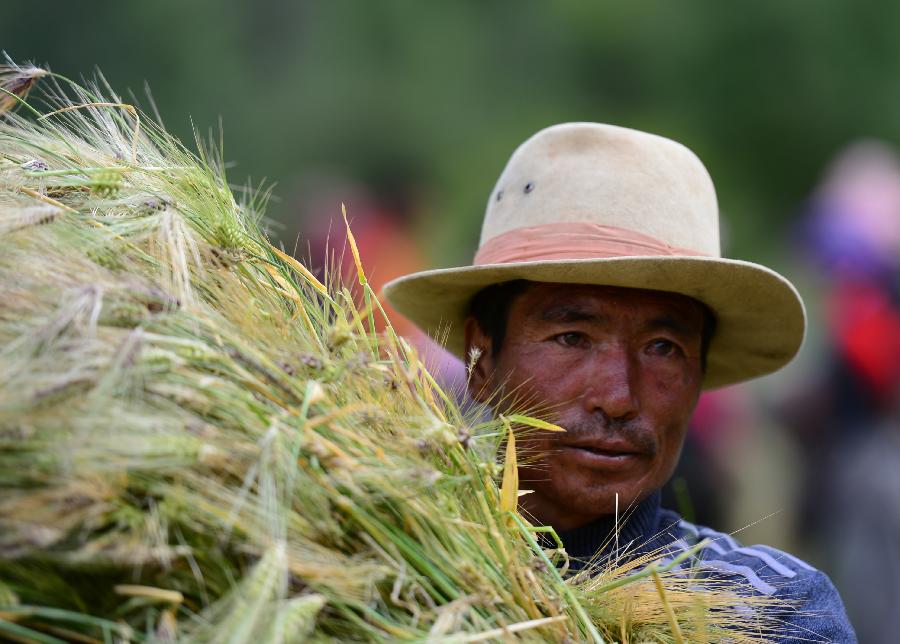 A villager carries immature highland barley in Zongang County of Qamdo Prefecture, southwest China's Tibet Autonomous Region, Aug. 14, 2013. A 6.1-magnitude quake jolted the border region of Zongang County and Markam County in Qamdo Prefecture on Monday morning. Rescuers and medical teams have headed for the quake-hit areas. (Xinhua/Chen Tianhu)