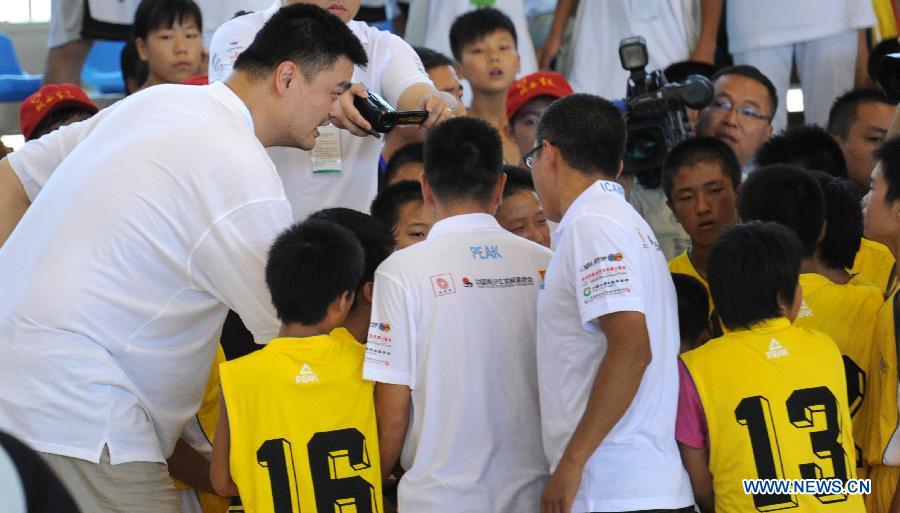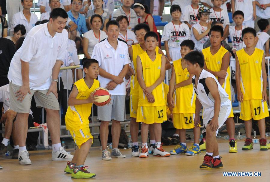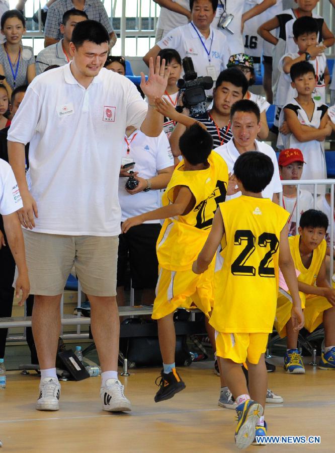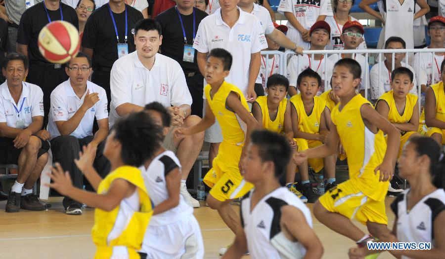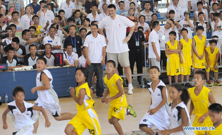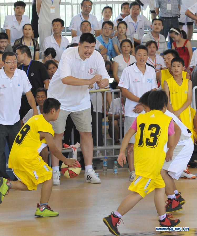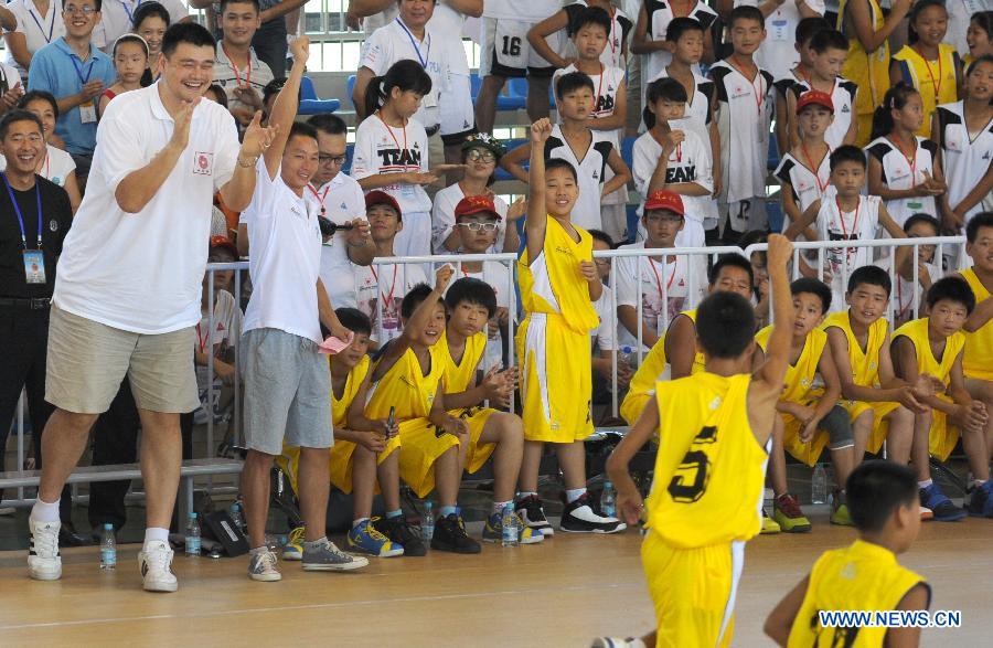 Former NBA player Yao Ming cheers for little players during a basketball match of the eastern division of the Yao Foundation Hope Primary School Basketball Season, in Lu'an City, east China's Anhui Province, Aug. 15, 2013. The basketball season was held to let the children in impoverished regions to enjoy the happiness of sports and grow up healthily. (Xinhua/Chen Li)