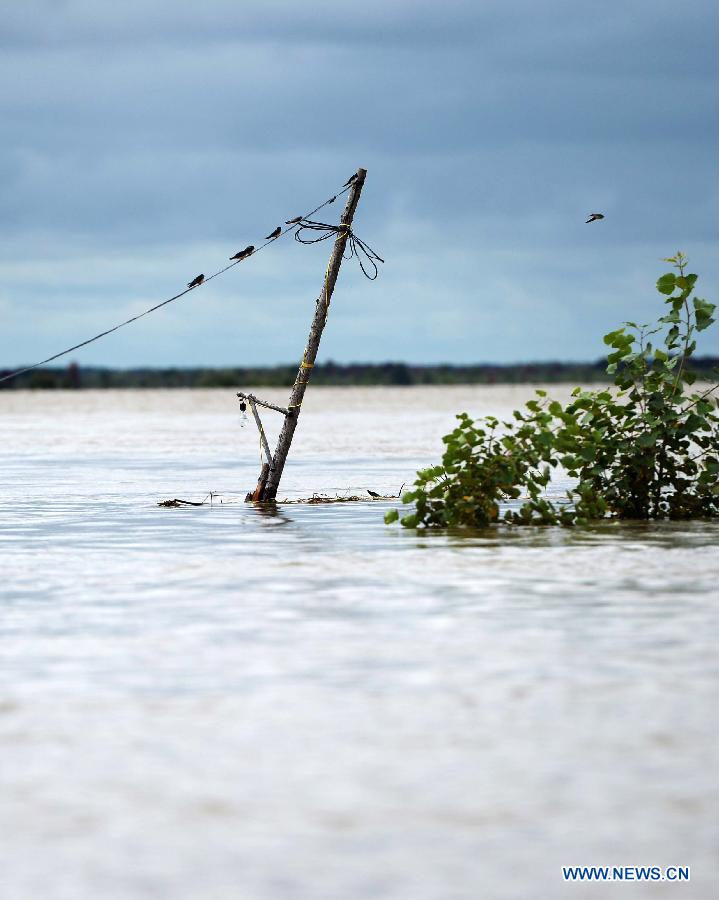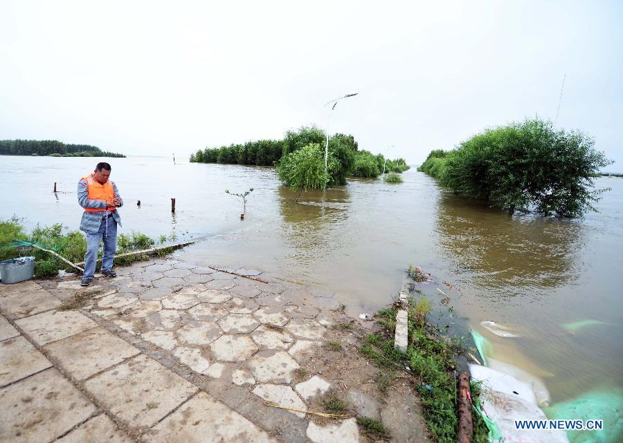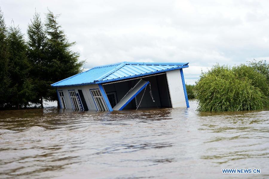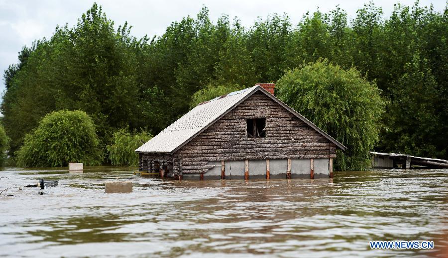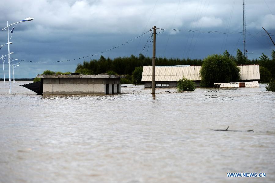 Flooded fields are seen along the swollen Heilong River in Tongjiang City, northeast China's Heilongjiang Province, Aug. 19, 2013. The Heilongjiang Provincial Hydrological Bureau forecast the stretch of the Heilong River between Tongjiang and Fuyuan County will witness the largest flooding in its history. Authorities in Tongjiang have started a Grade I response preparing for floods. (Xinhua/Wang Kai)