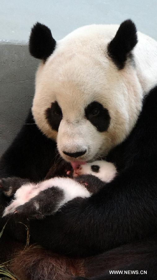 Giant panda cub nicknamed "Yuan Zai" sleeps at the Taipei Zoo in Taipei, southeast China's Taiwan, Aug. 19, 2013. The female cub, born on July 6, is the first baby of a pair of giant pandas, namely "Tuan Tuan" and "Yuan Yuan", who were given as a goodwill gift to Taiwan by the Chinese mainland. (Xinhua/Taipei Zoo)