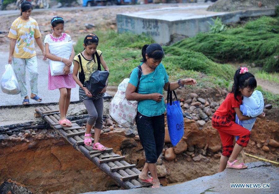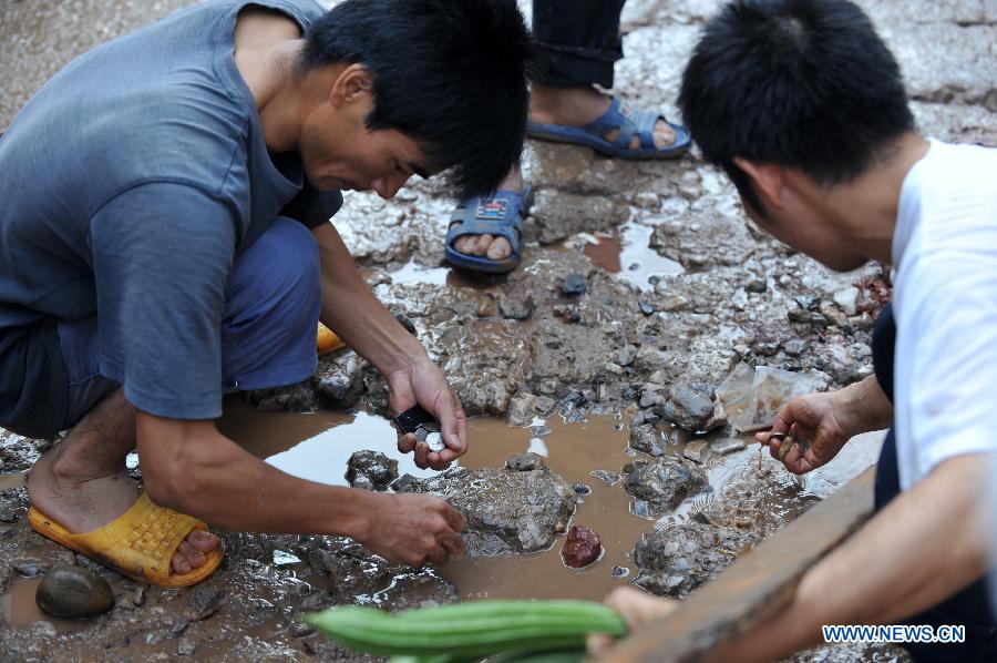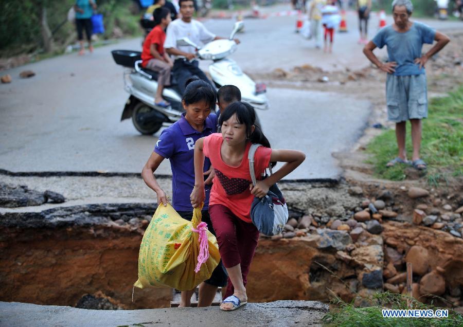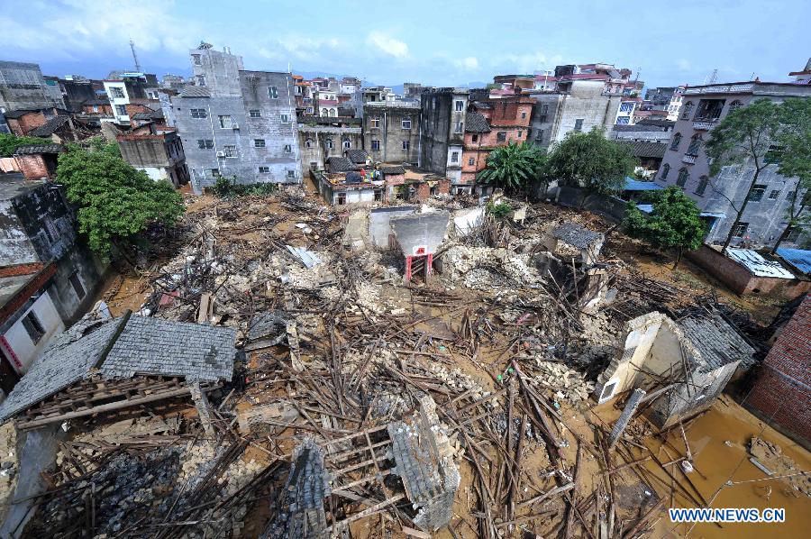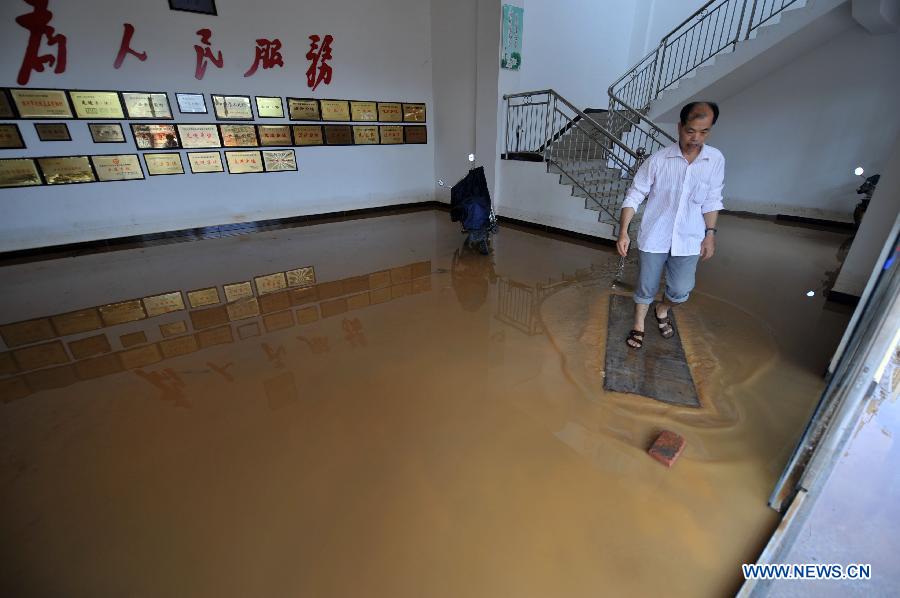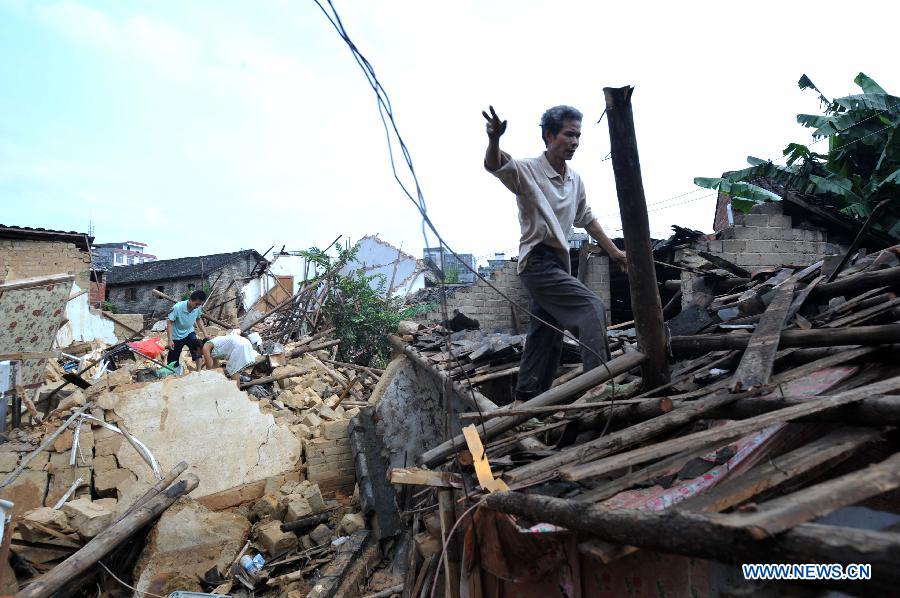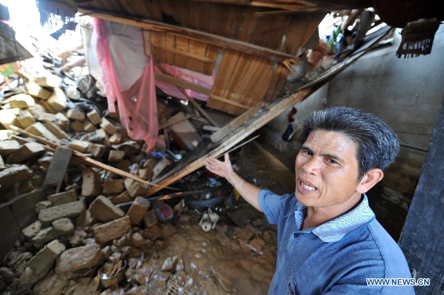 Chen Jianyou, a villager of the Xinwei Village, talks about his 10 houses destroyed by the floods in Guiping City, south China's Guangxi Zhuang Autonomous Region, Aug. 20, 2013. The Typhoon Utor has affected 1.2861 million people and killed 15 in Guangxi by Tuesday afternoon, according to the local civil administration department. (Xinhua/Zhou Hua)