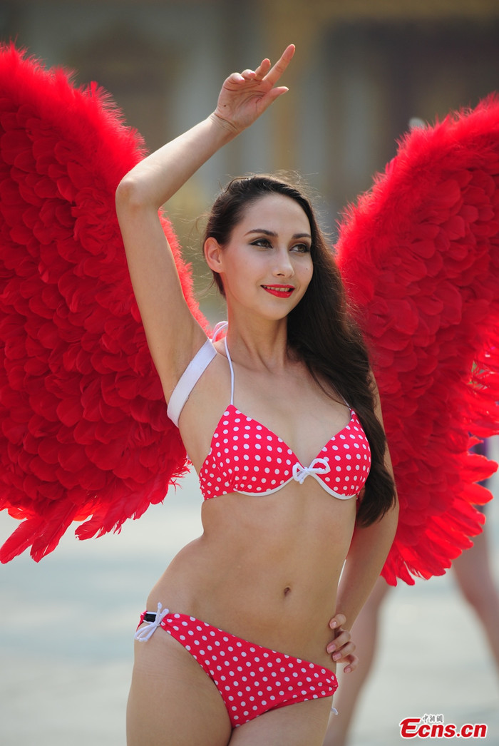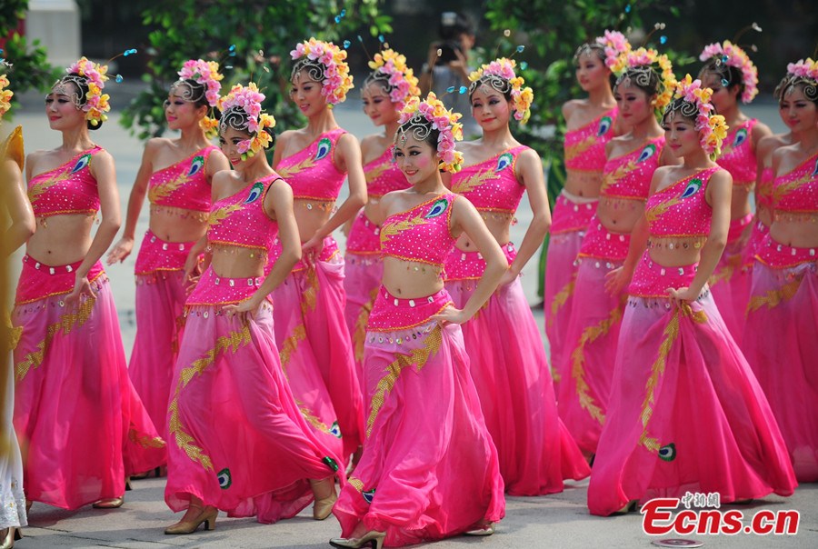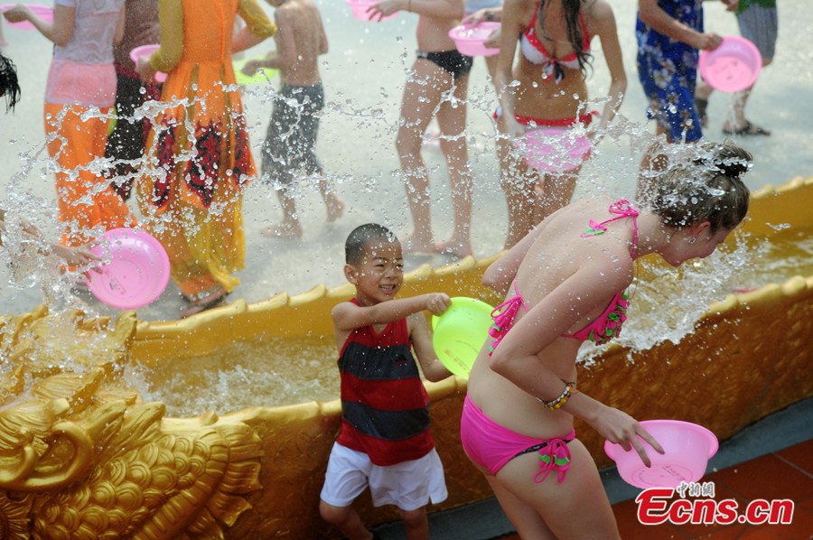 Young girls have fun at a water-pouring game of a carnival in a folk culture village of Shenzhen, south China's Guangdong province on August 20, 2013. [Photo: CNS / Chen Wen]