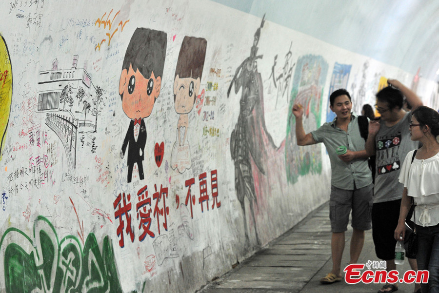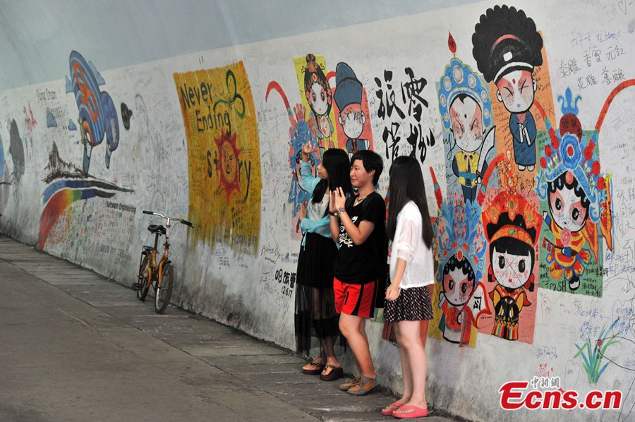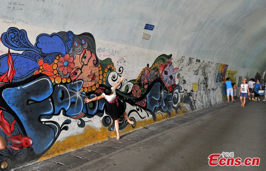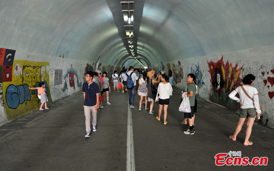 Photo taken on August 20 shows the artistic Furong Tunnel in Xiamen University. As a popular tourist attraction of the university, the 1455-meter-long tunnel is famous for its beautiful graffiti on the walls, drawn by the university's creative students. It's also hailed as the most artistic graffiti tunnel among Chinese universities. [Photo/Lv Ming]