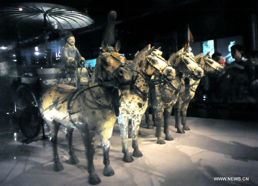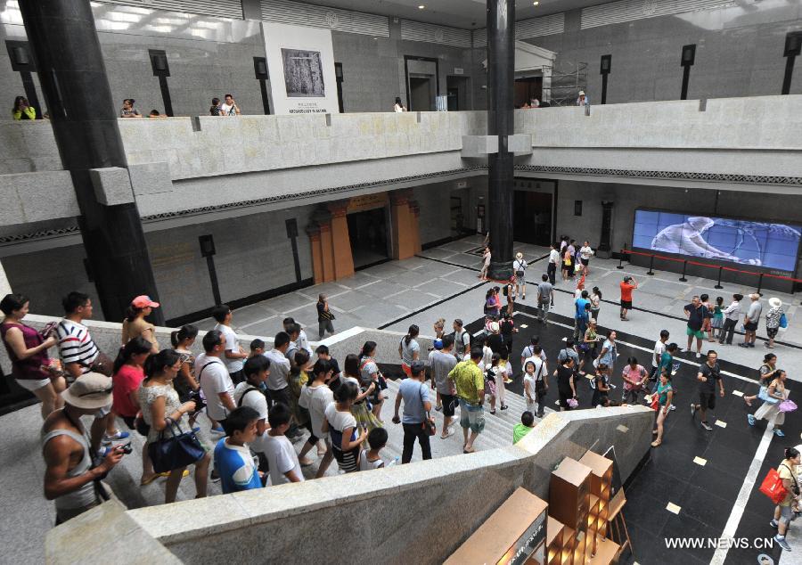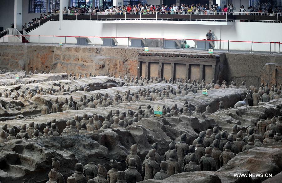 Tourists visit the terracotta warriors and horses at the Emperor Qinshihuang's Mausoleum Site Museum in Xi'an, capital of northwest China's Shaanxi Province, Aug. 20, 2013. The museum witnessed a tourism peak since August. (Xinhua/Chen Haining)
