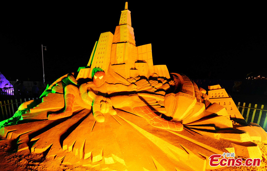 Photo taken on August 20 shows a sand sculpture at Longfengtou Bathing Beach of Pingtan in Fujian province. The sand sculptures at the beach are all created under the theme of popular movies. [Photo/Zhang Bin]