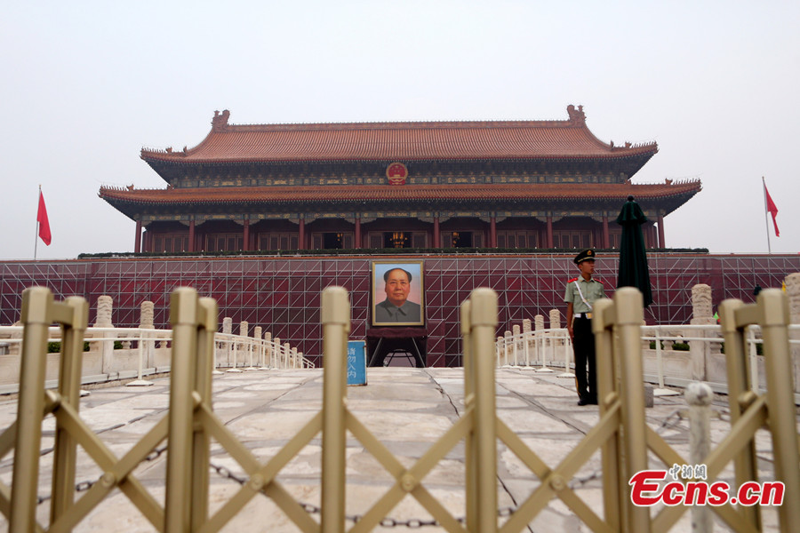 Photo taken on August 21, 2013 shows that the whole gate on the Tiananmen Square was covered in scaffolding. The annual renovation project has started and will end ahead of the National Day. [Photo: CNS/ Li Huisi]