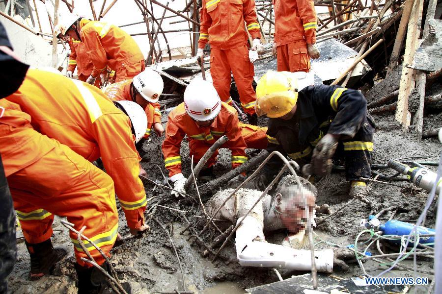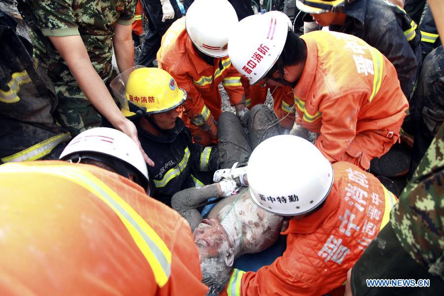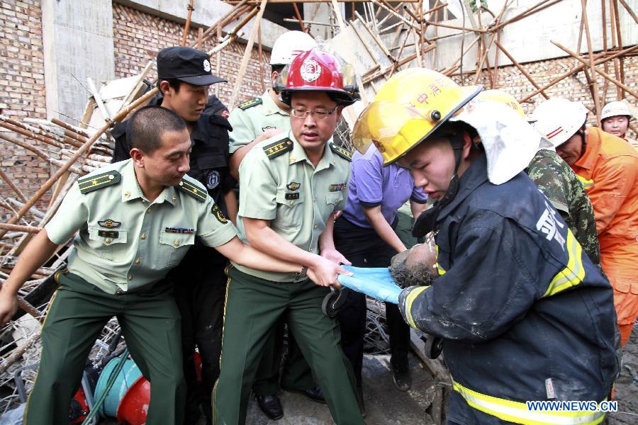 Rescuers evacuate an injured worker from a collapsed construction site in Jinzhong City, north China's Shanxi Province, Aug. 20, 2013. Main body of the vinegar factory under construction collapsed Tuesday afternoon, killing three workers and injuring another ten. (Xinhua/Han Rui)