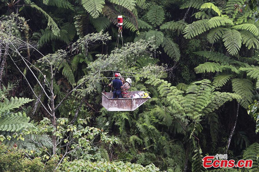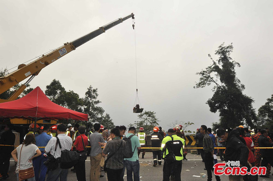 Rescuers work at the scene of bus plunge at Genting Highlands resort in the state of Pahang, Malaysia, on August 21, 2013. At least 37 were killed after a tourist bus plunged into a ravine near Malaysia's Genting Highlands resort on Wednesday. Police said at least three foreigners were in the bus, including one Chinese citizen. (Photo/CNS)