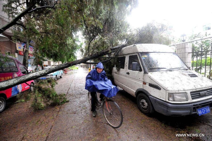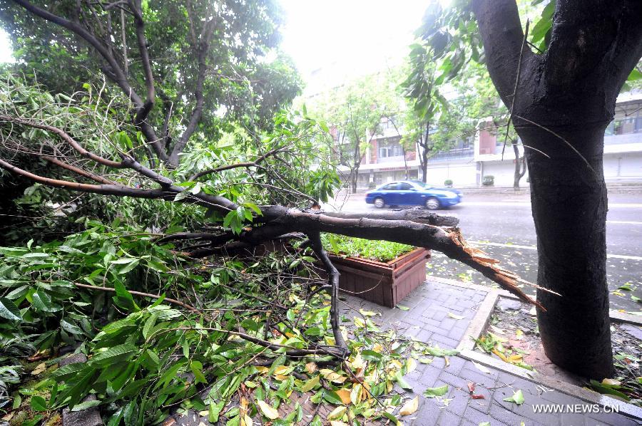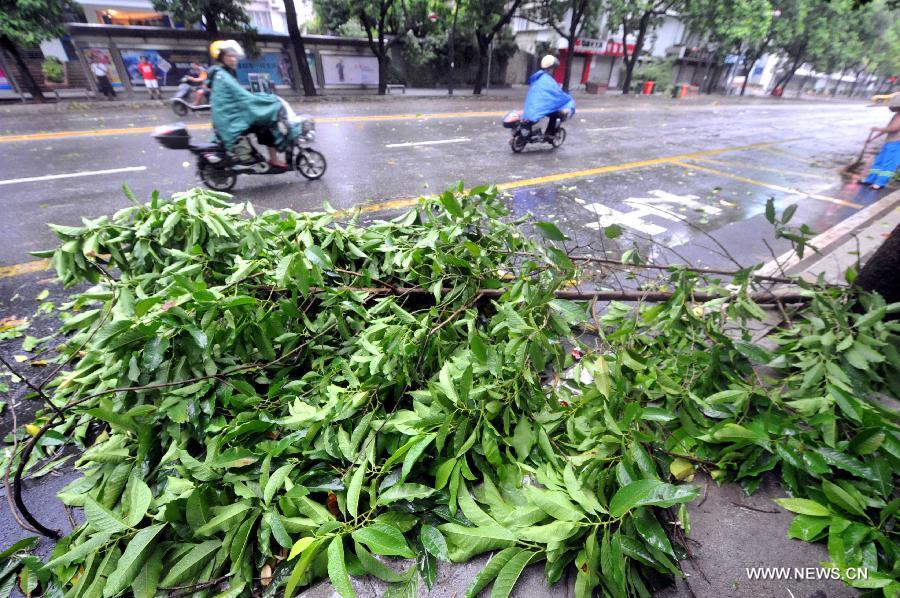 A cleaner clears up the road by which the bamboos are blown down by wind at Guping Road in Fuzhou City, capital of southeast China's Fujian Province, Aug. 22, 2013. Trami, the 12th tropical storm hitting China this year, landed at 2:40 a.m. in Fuqing City of the province, packing strong winds of 35 meters per second at the storm center, according to the Fujian provincial meteorological observatory. (Xinhua/Peng Zhangqing)
