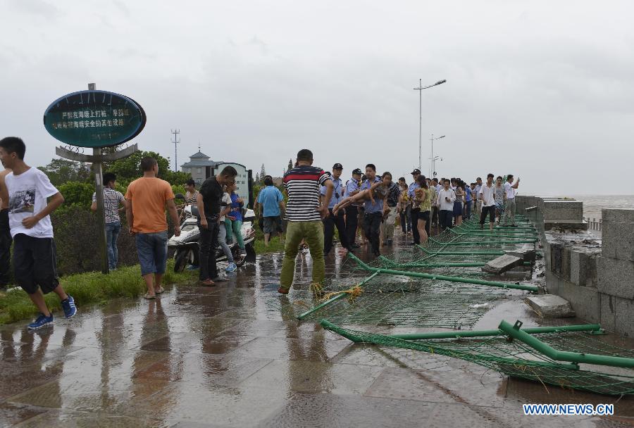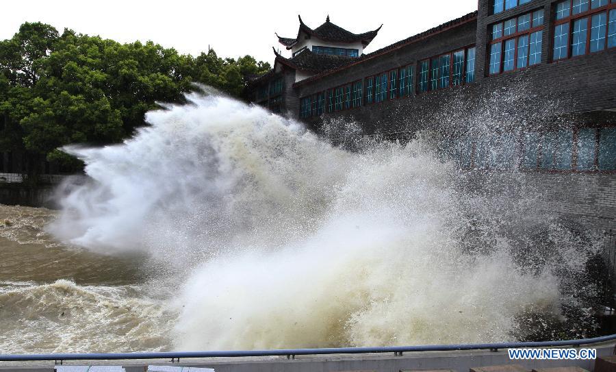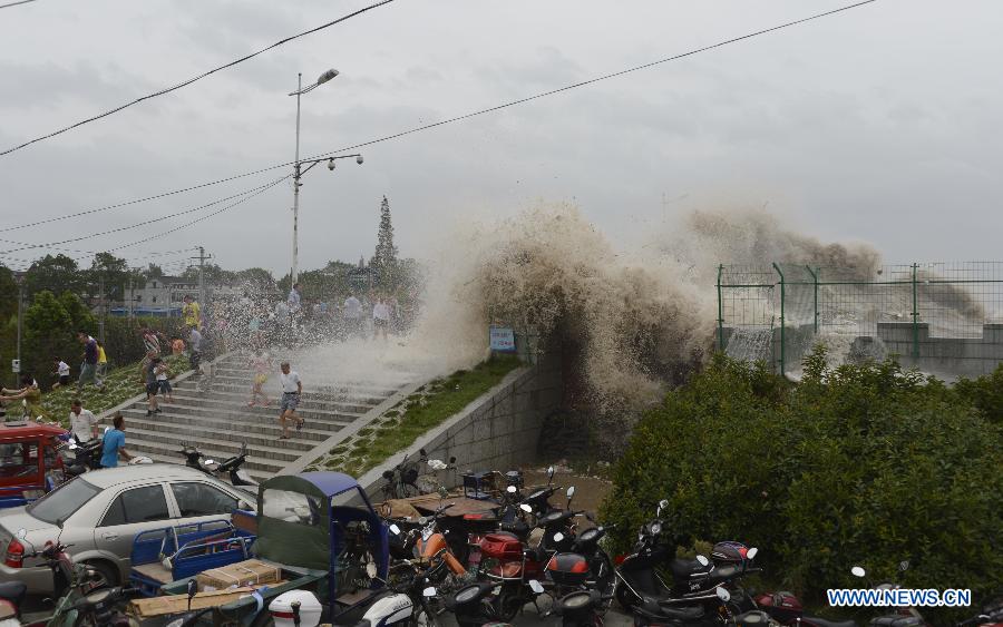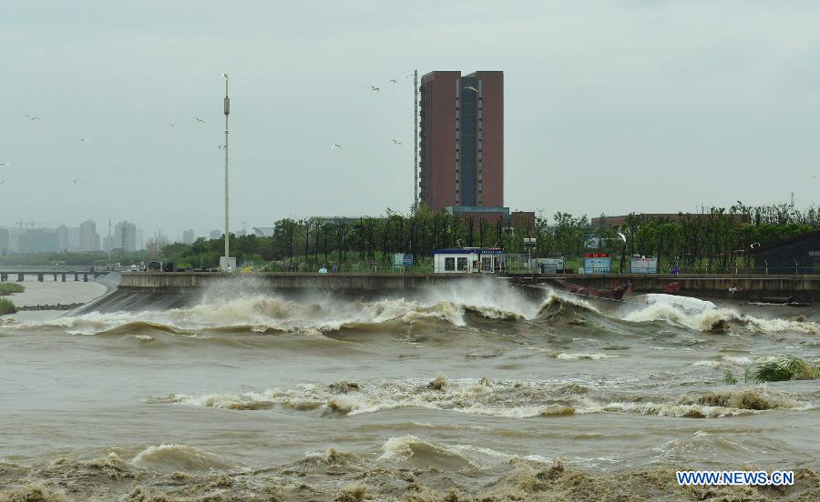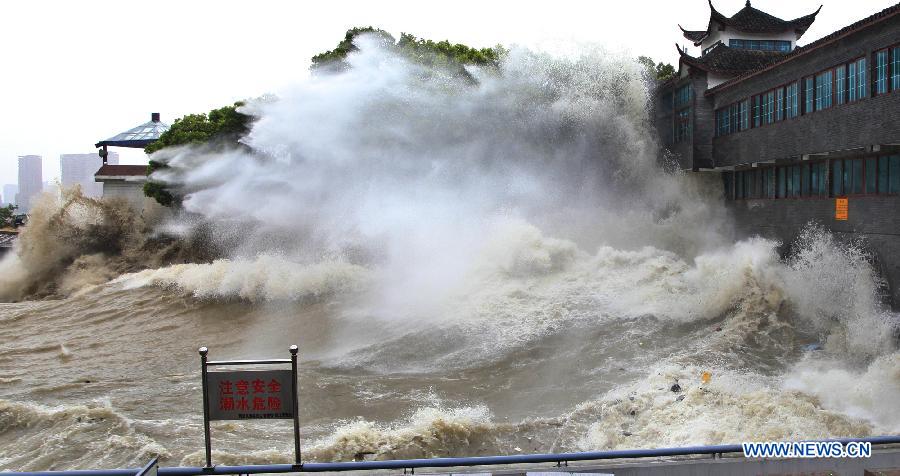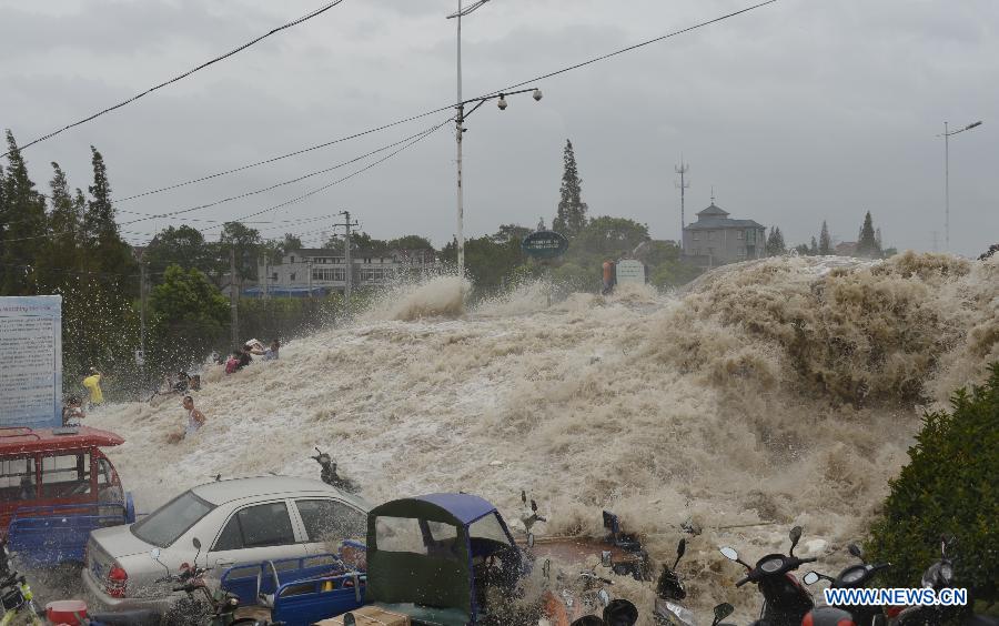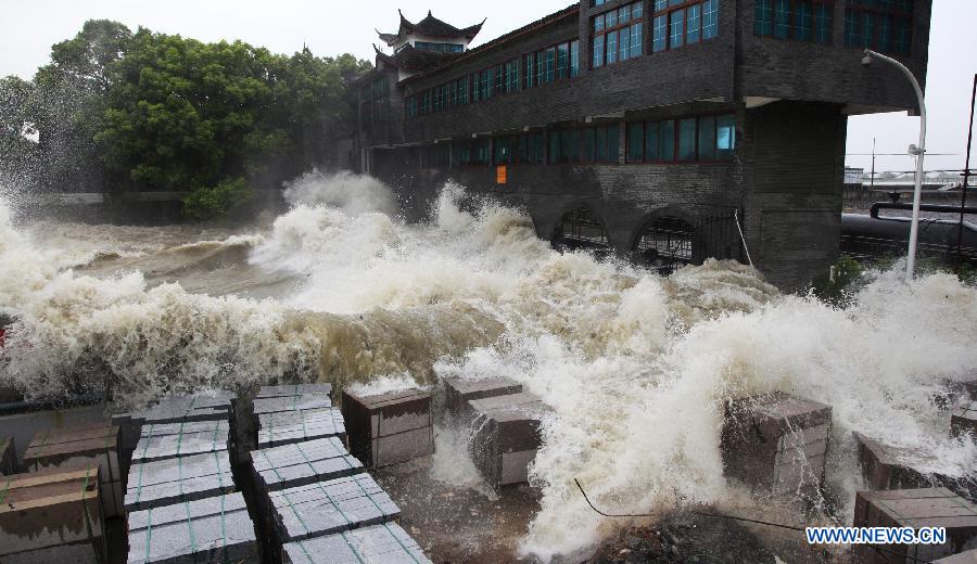 Surging waves of Qiantang River pound the buildings of a water plant in Hangzhou, capital of east China's Zhejiang Province, Aug. 22, 2013. The power of Typhoon Trami, was felt in the tidal bore of the Qiantang River, known as the world's largest tidal bore. (Xinhua/Chen Jiahua)