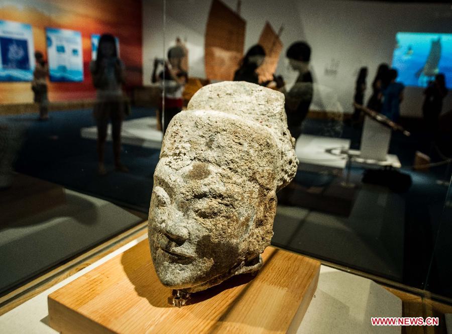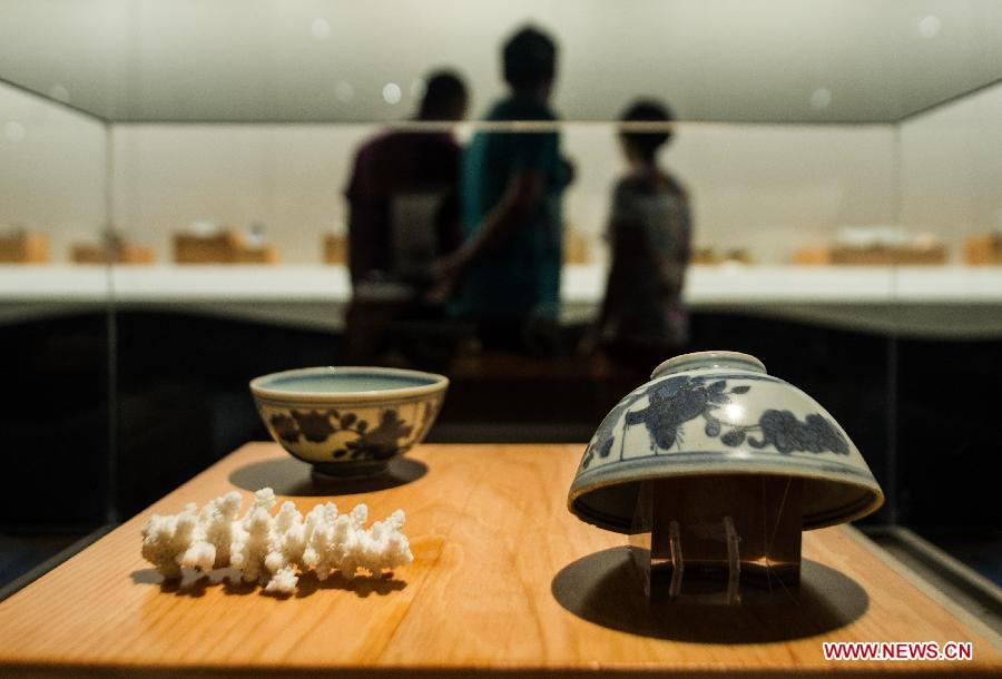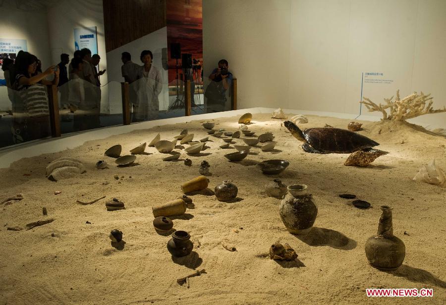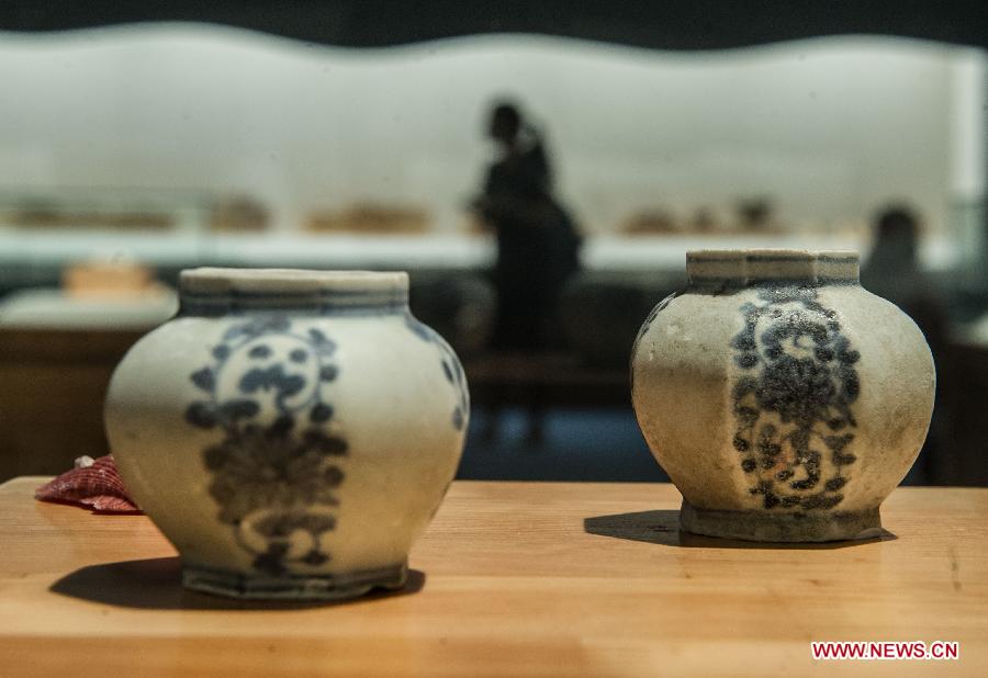 Pieces of antique porcelain recovered from a shipwreck in the Xisha Islands in the South China Sea are on display at the Capital Museum in Beijing, capital of China, Aug. 22, 2013. An exhibition featuring some 280 findings from the shipwreck on Huaguang Reef No.1 opened Thursday at the museum. The wreck, dating back to the Southern Song Dynasty (1127-1279), was stumbled upon by a group of Chinese fishermen in 1996, three meters below sea water. (Xinhua/Luo Xiaoguang)