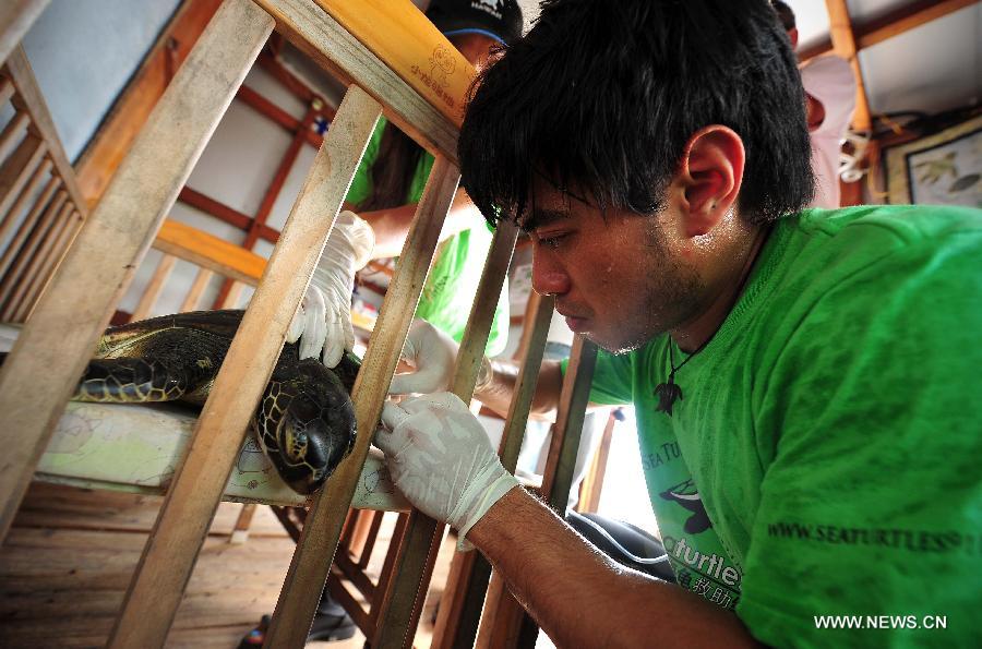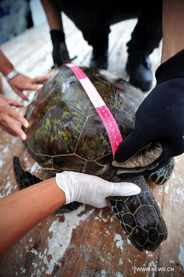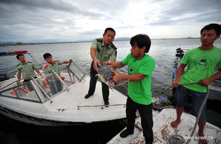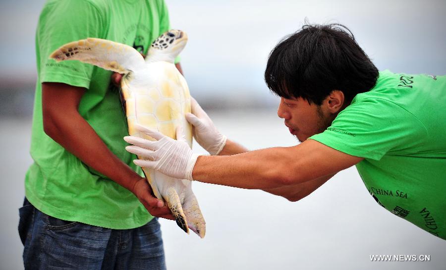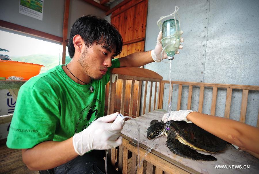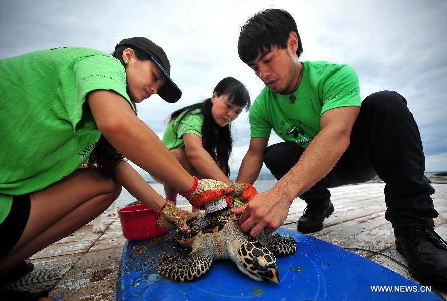 Frederick C. Yeh (C), a member of the Sea Turtles 911, receives an injured sea turtle in Lingshui, south China's Hainan Province, Aug. 21, 2013. Sea Turtles 911 is an international non-profit organization dedicated to sea turtle conservation, and it focuses on the coastal regions of Hainan, home to the critically endangered Hawksbill Sea Turtle and the endangered Green Sea Turtle. (Xinhua/Guo Cheng)