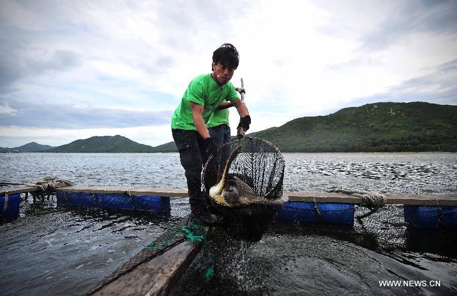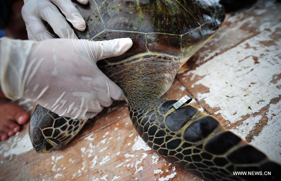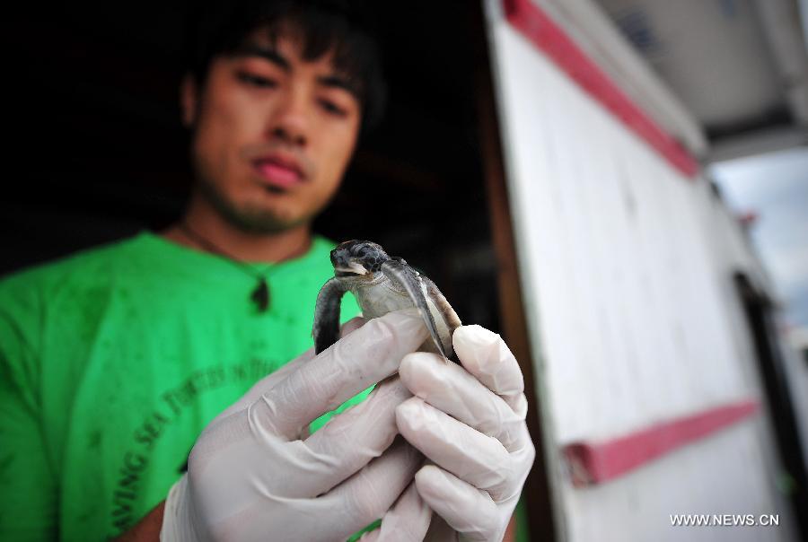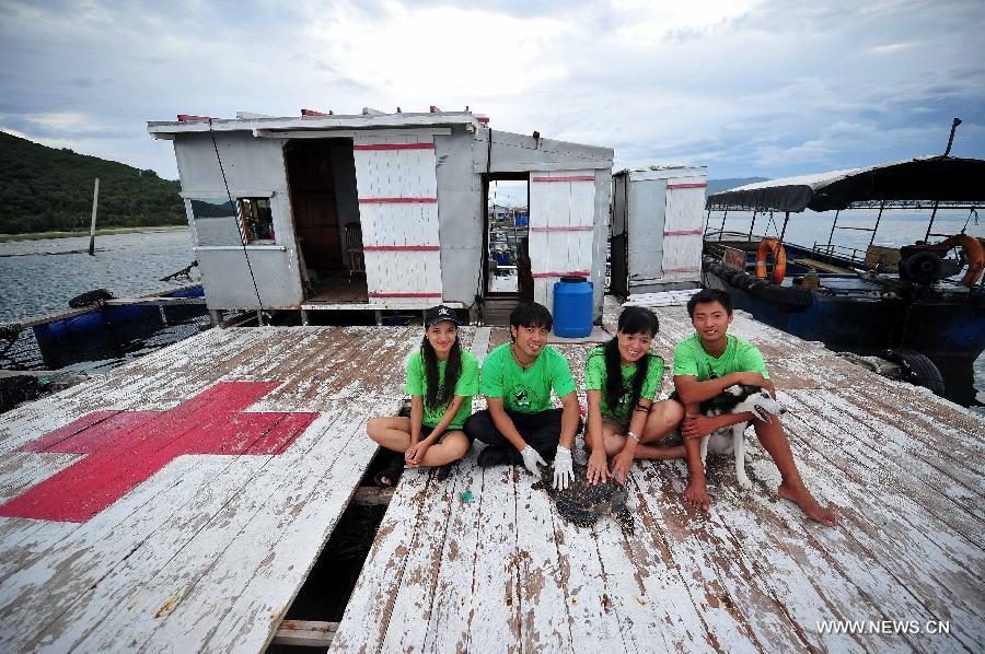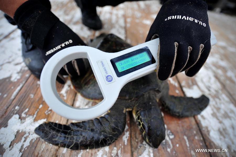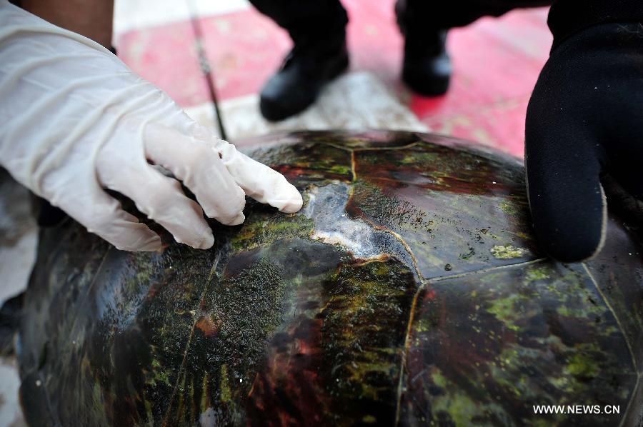 Frederick C. Yeh (C), a member of the Sea Turtles 911, receives an injured sea turtle in Lingshui, south China's Hainan Province, Aug. 21, 2013. Sea Turtles 911 is an international non-profit organization dedicated to sea turtle conservation, and it focuses on the coastal regions of Hainan, home to the critically endangered Hawksbill Sea Turtle and the endangered Green Sea Turtle. (Xinhua/Guo Cheng)