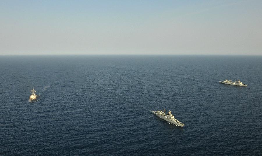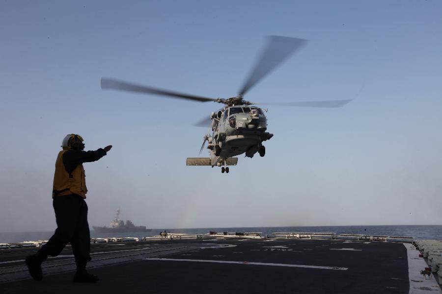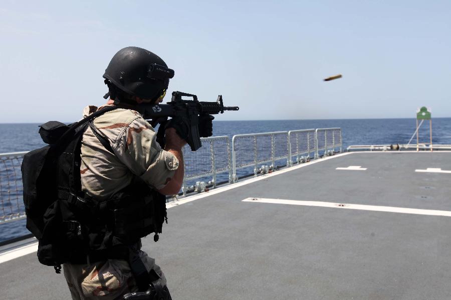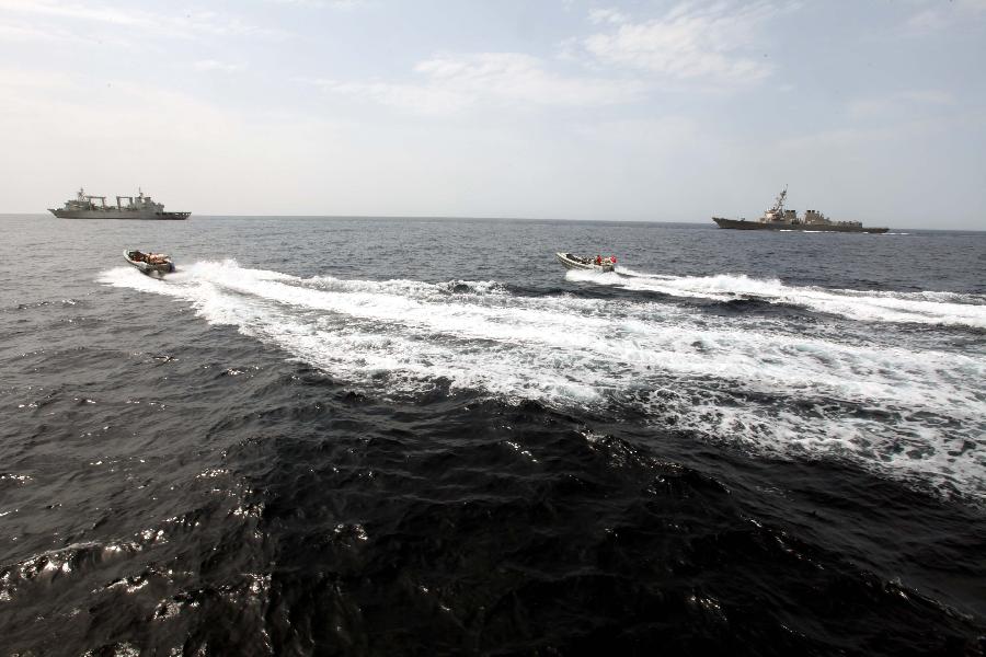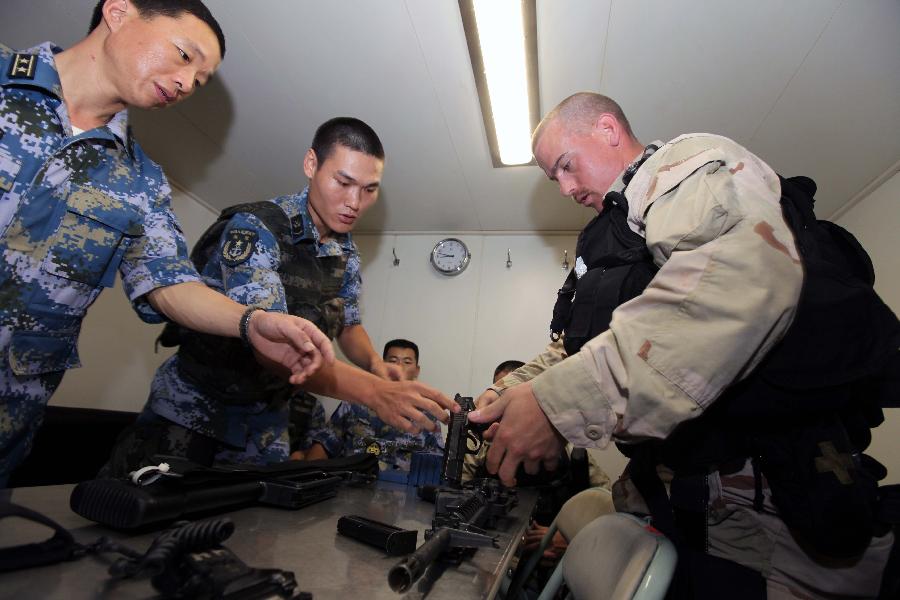 Chinese and U.S. soldiers participate in the counter-piracy exercise on the missile destroyer "Harbin" of Chinese navy in the Gulf of Aden, Aug. 25, 2013. The Chinese and U.S. navies conducted a joint counter-piracy exercise in the Gulf of Aden on Saturday and Sunday.(Xinhua/Rao Rao)