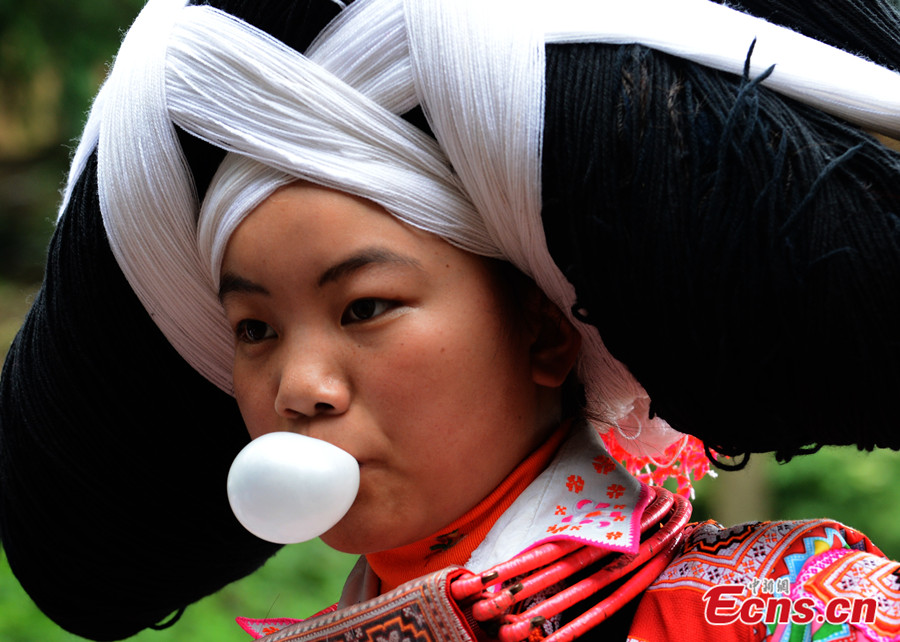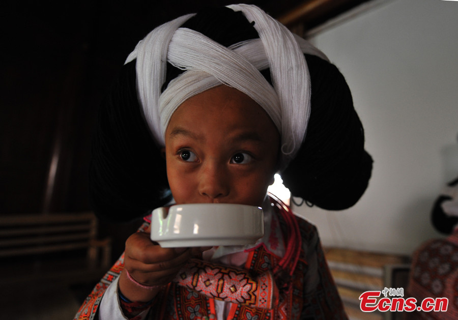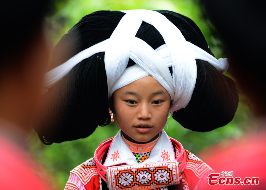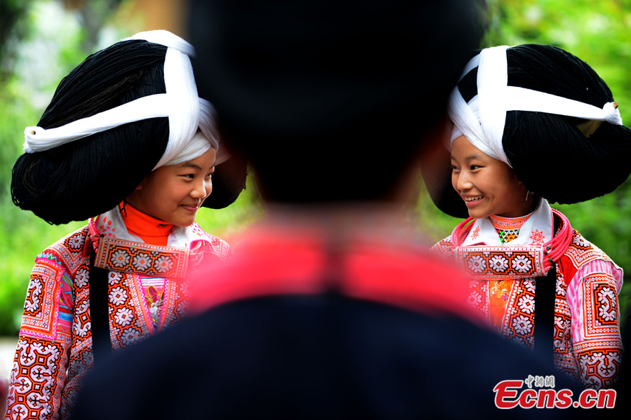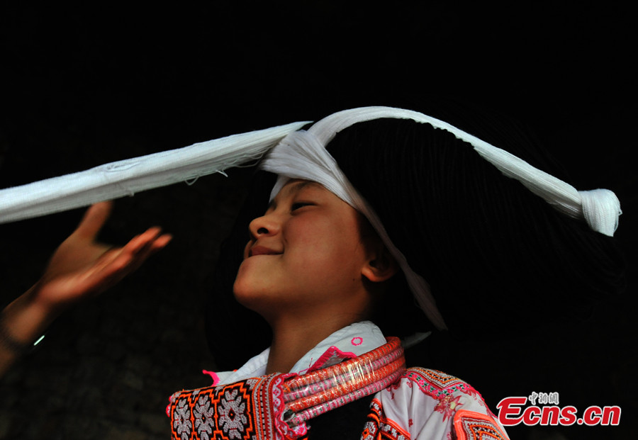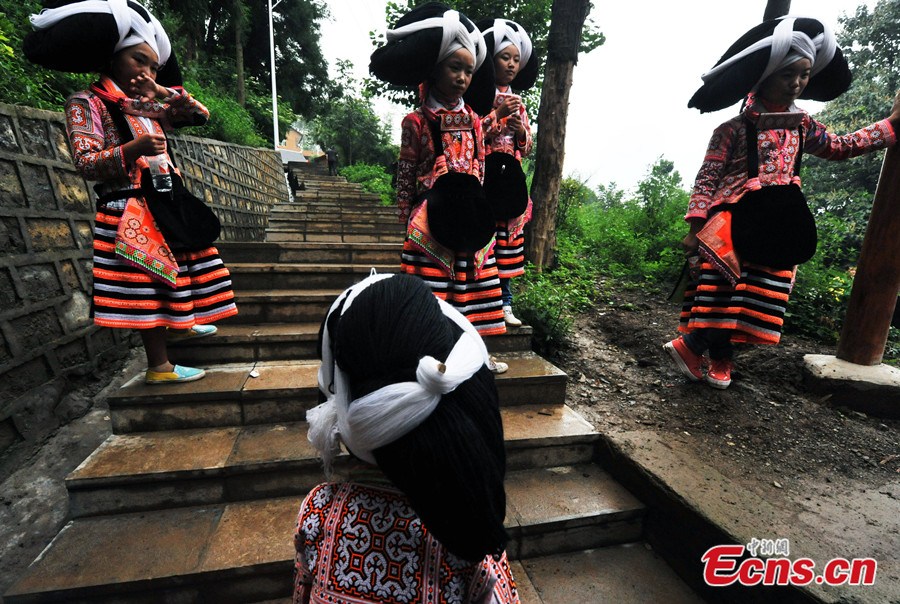 Photo taken on August 20, 2013 shows Long-horn Miao Nationality girls with huge horn-shaped headdresses at a museum of Suojia Villlage, southwest China's Guizhou province. Suojia Villlage is home to the Long-horn Miao, one of the small branches of Miao nationality. [Photo: CNS / Jia Guorong]