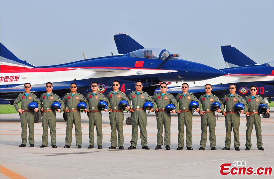 Altogether 11 members of the Bayi Aerobatic Team of the Chinese People's Liberation Army (PLA) Air Force who will perform at the 11th Moscow Airshow poses for a group photo on Aug 26, 2013 in Moscow, Russia. The team will give three performances at the Ramenskoye Airport between Aug 30 and Sep 1, 2013. [Photo: CNS/ Shen Jinke]