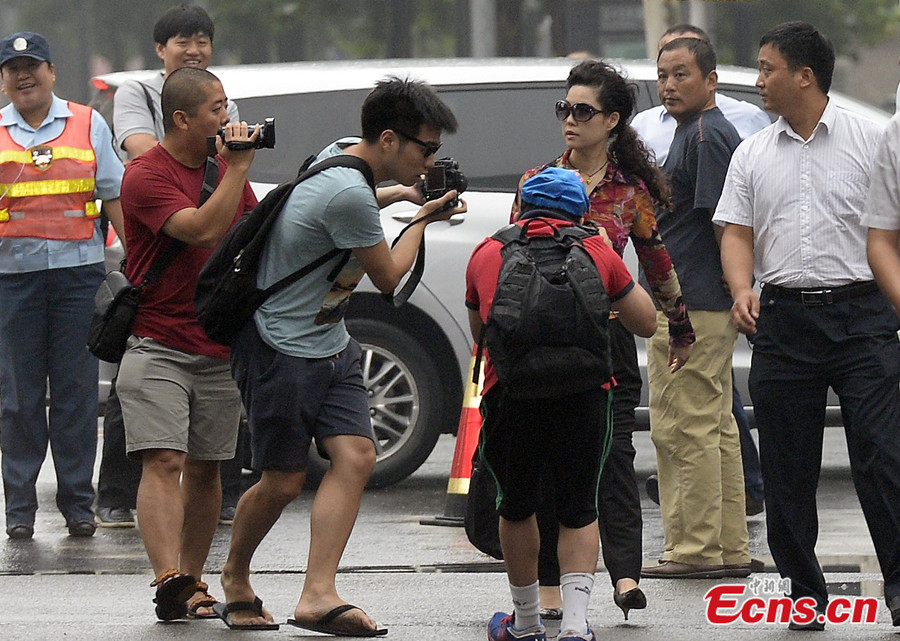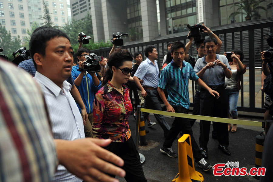 Well-known People's Liberation Army (PLA) singer Li Shuangjiang's teenage son, who as allegedly involved in a gang-rape case, stood trial at a Beijing district court on August 28, 2013. Photo shows Junior Li's mother, Meng Ge, arrives at the court. [Photo: Chinanews.com / Jin Shuo]