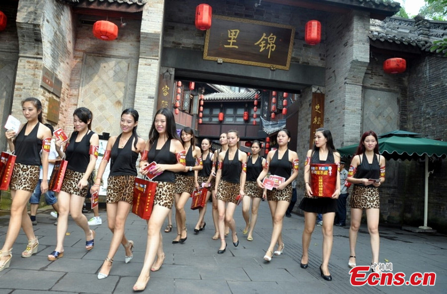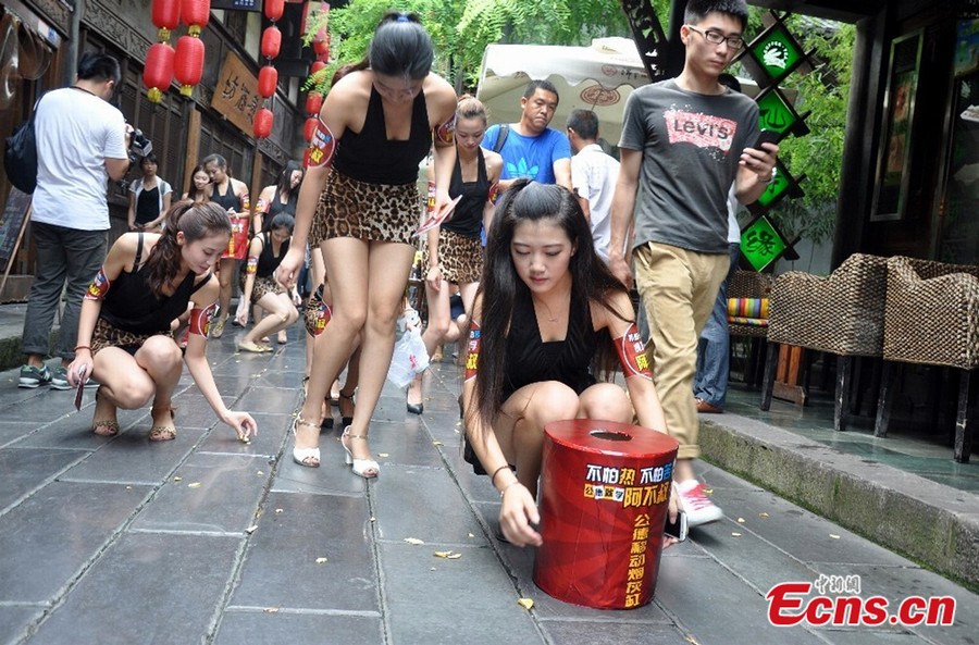 Girls in leopard print mini skirts collect rubbish on Jinli Ancient Street in Chendu of southwest China's Sichuan province on August 28, 2013. A total of 40 young girls took part in Wednesday's activity to promote the public awareness on protecting community environment. [Photo: CNS / Lin Feng]