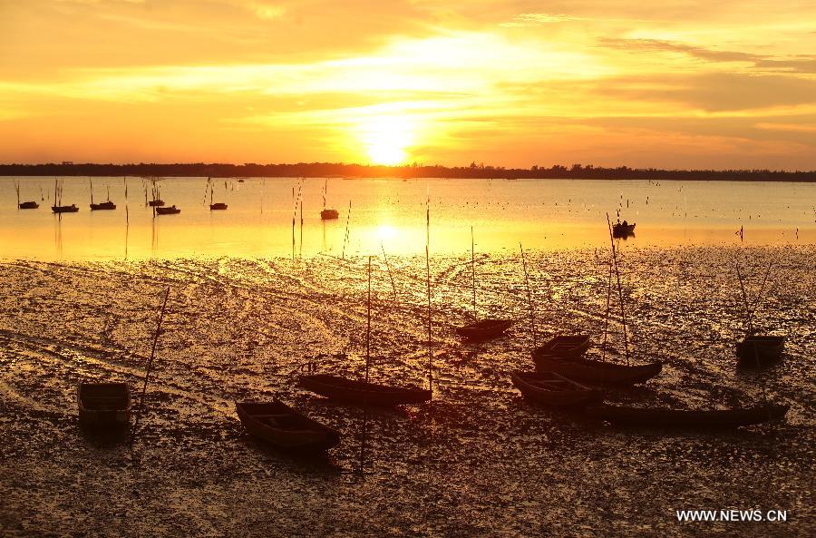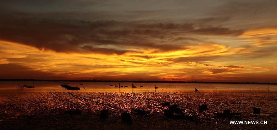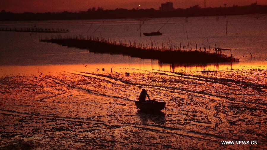 A fisherfolk walks on the beach during the sunset in Sanjiang Town, Haikou, south China's island of Hainan Province, Aug. 28, 2013. (Xinhua/Chen Wenwu)