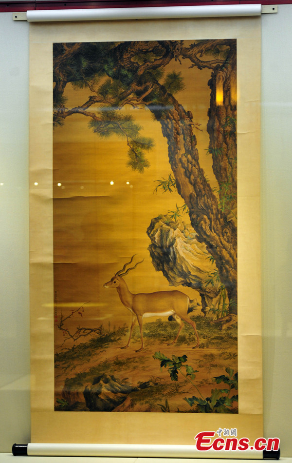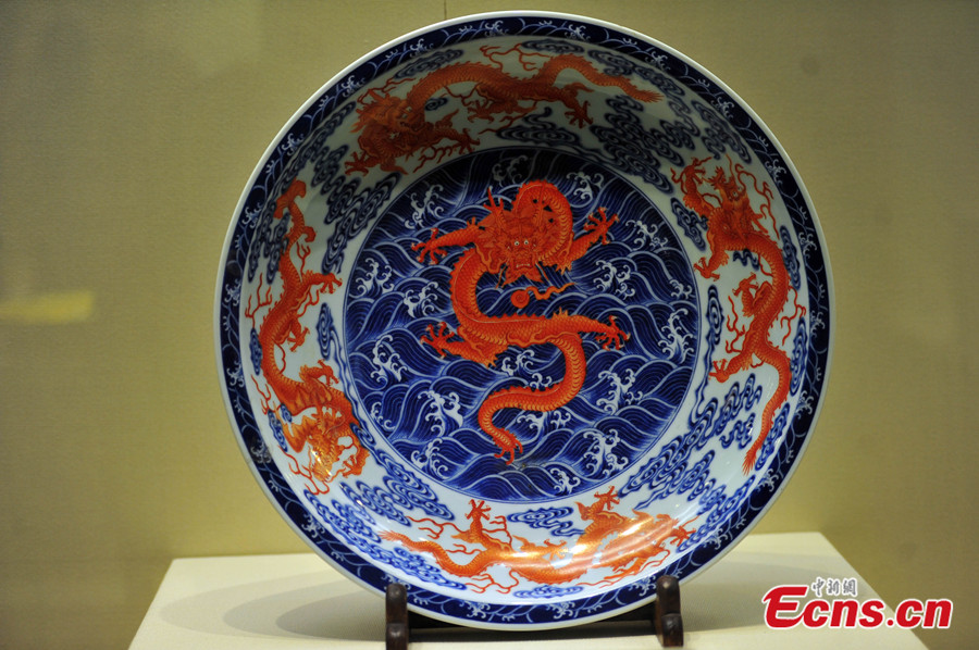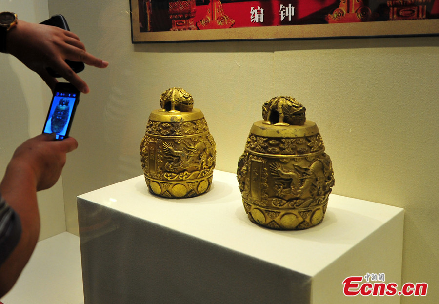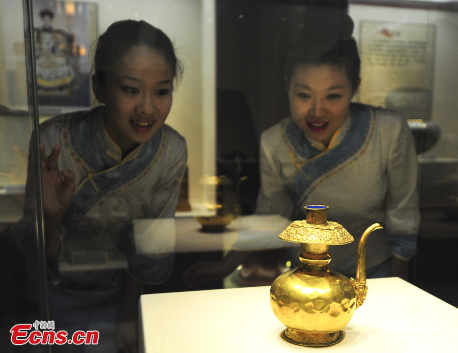 Visitors look at a piece of treasure at an exhibition in Shenyang Palace Museum of Shenyang City, Liaoning province on August 28, 2013. Fifty-three pieces of treasure from the museum are on display at the exhibition for the first time. [Photo: CNS / Yu Haiyang]
