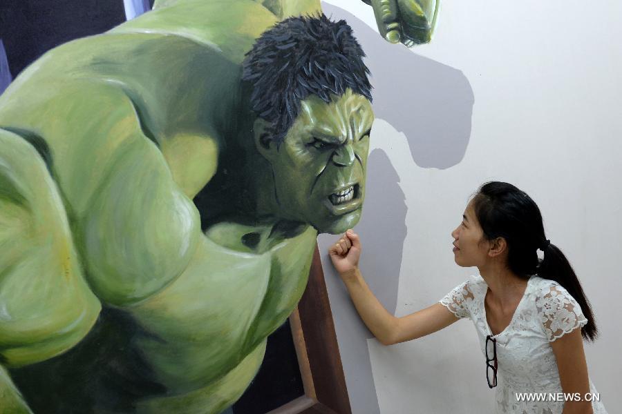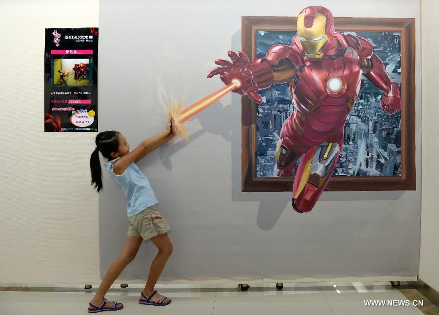 A girl poses for a photo at a 3D painting exhibition in Xi'an, capital of northwest China's Shaanxi Province, Aug. 29, 2013. Some 40 pieces of 3D work were displayed in the exhibition which will last till Oct. 22. (Xinhua/Li Yibo)
