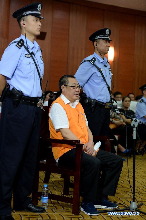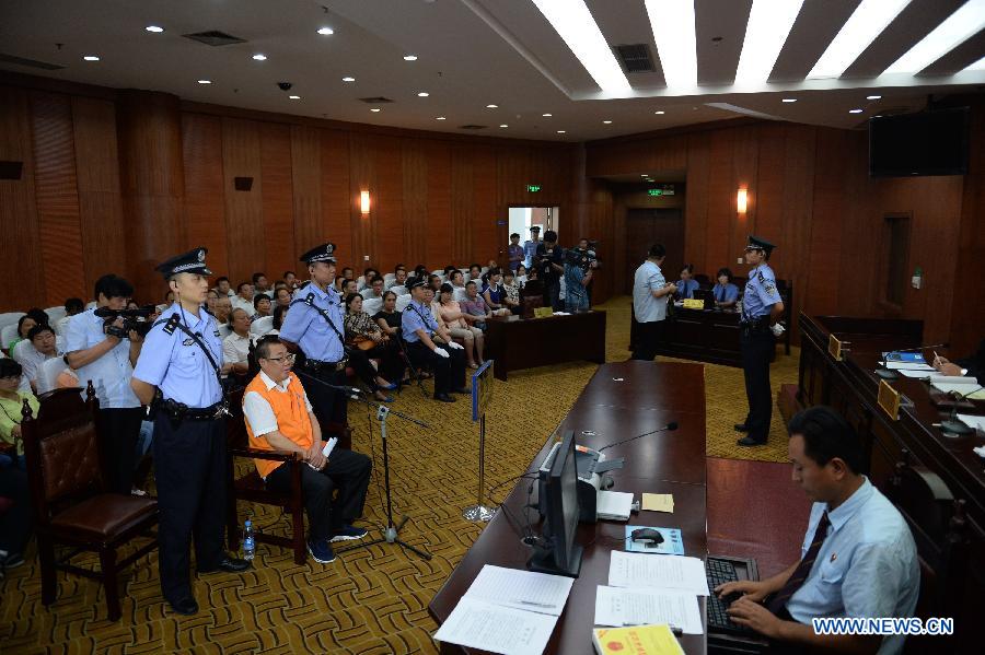 Photo taken on Aug. 30, 2013 shows the court trial of Yang Dacai, former head of the Shaanxi provincial work safety administration, at the Xi'an Intermediate People's Court in Xi'an, northwest China's Shaanxi Province. Yang Dacai, who was the subject of nationwide outrage after being photographed smiling at the scene of a fatal bus crash last year, stood trial at the court on Friday for charges of taking bribes and holding a huge amount of property with unidentified sources. (Xinhua/Li Yibo)