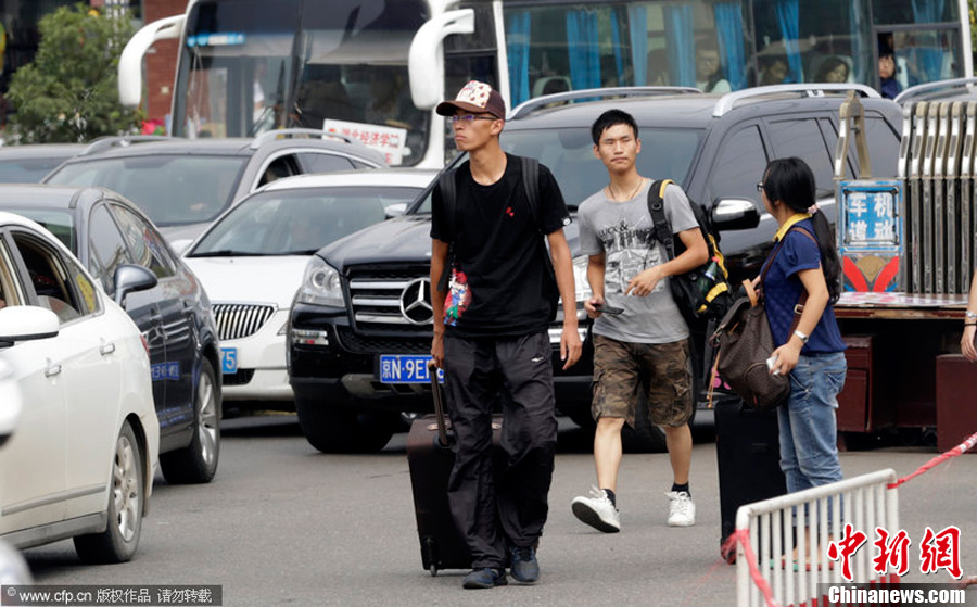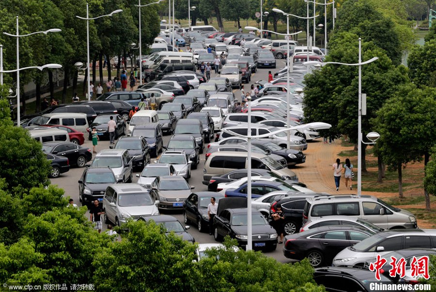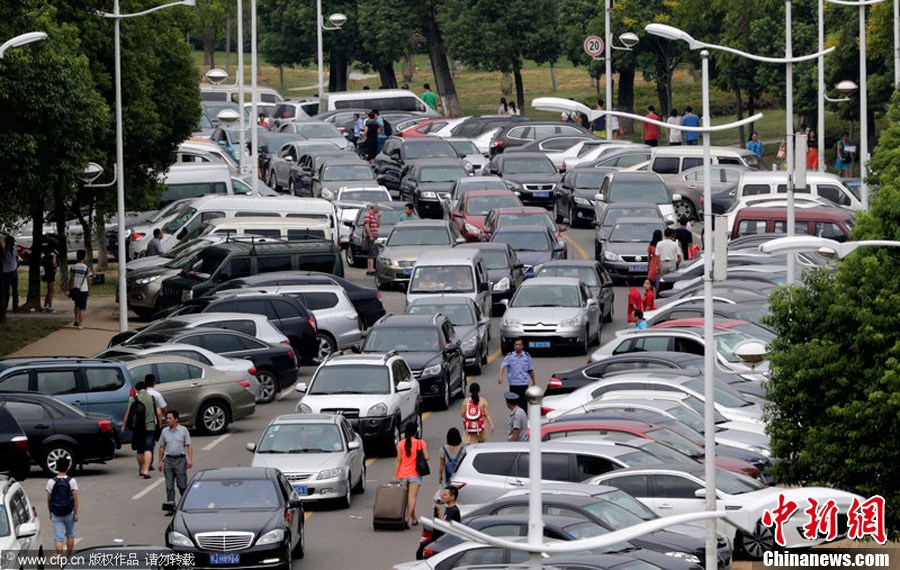 The traffic is jamming the roads in Central China’s Hubei University of Economics on Aug 31, 2013, as a large number of students are driven to school by parents for enrollment. [Photo: CFP]