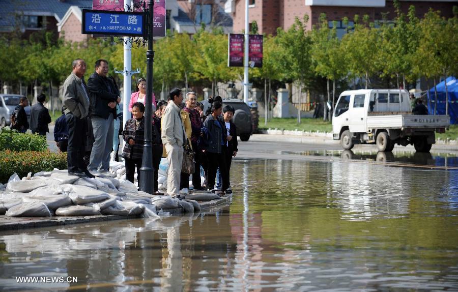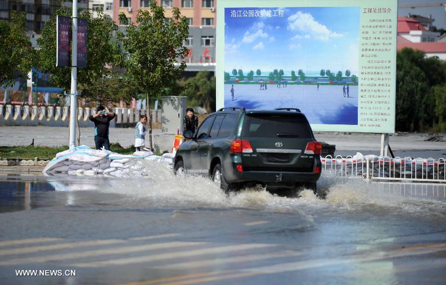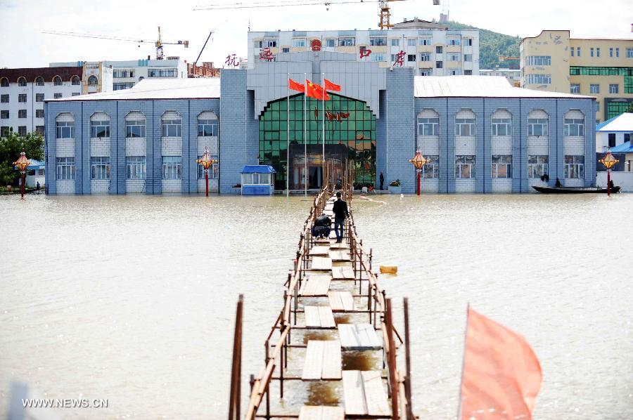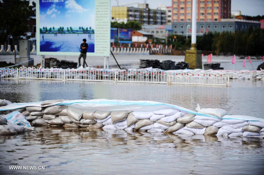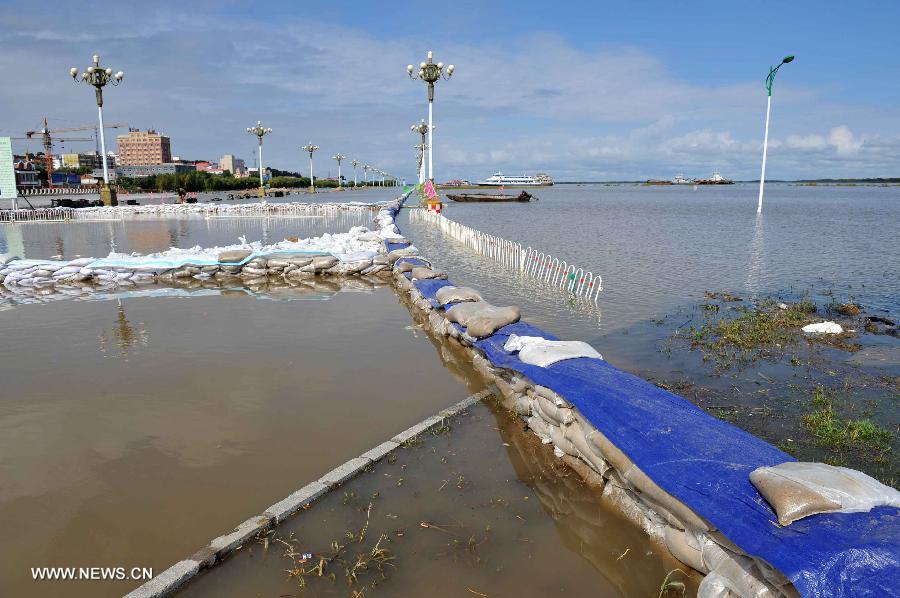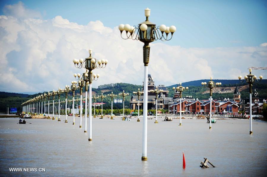 The Fuyuan Port is surrounded by floods in Fuyuan County, northeast China's Heilongjiang Province, Sept. 1, 2013. The flood peak has arrived at the Fuyuan section of Heilongjiang River. At 8 a.m. on Sunday, the water level has risen to a record high of 89.85 meters, 2.35 meters above the warning level. (Xinhua/Wang Jianwei)