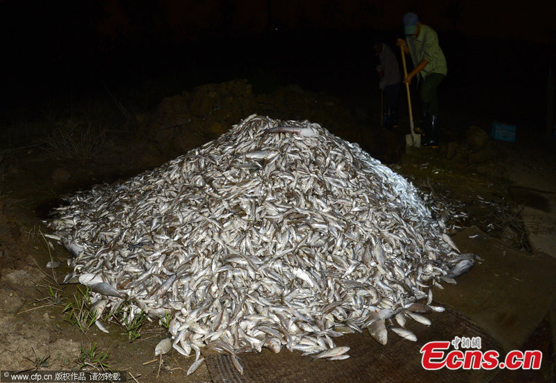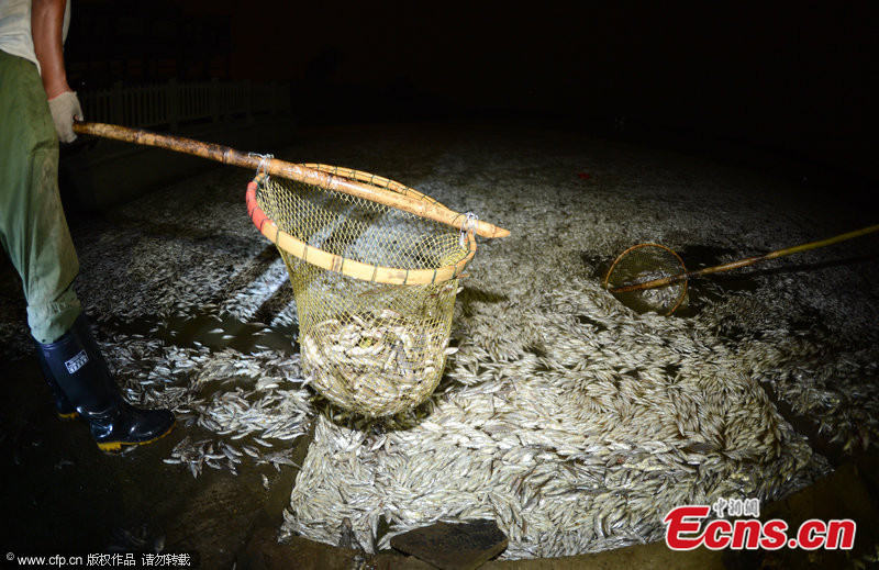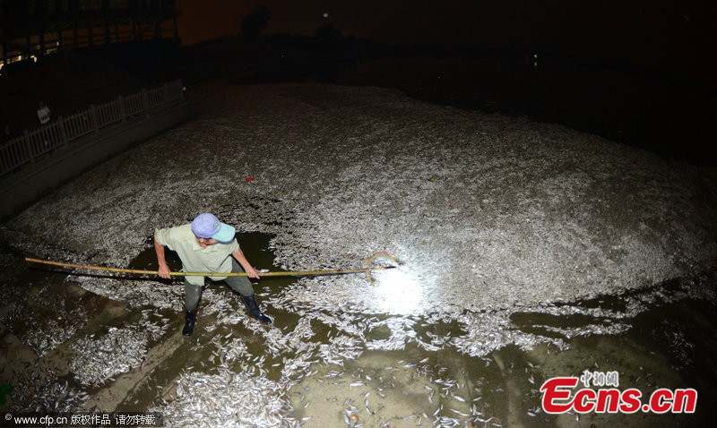A worker collects dead fish in a river of Wuhan city, central China's Hubei province on September 2, 2013. Hundreds of dead fish are found in the river, which may be caused by upstream pollution, according to preliminary investigation. [Photo/CFP]