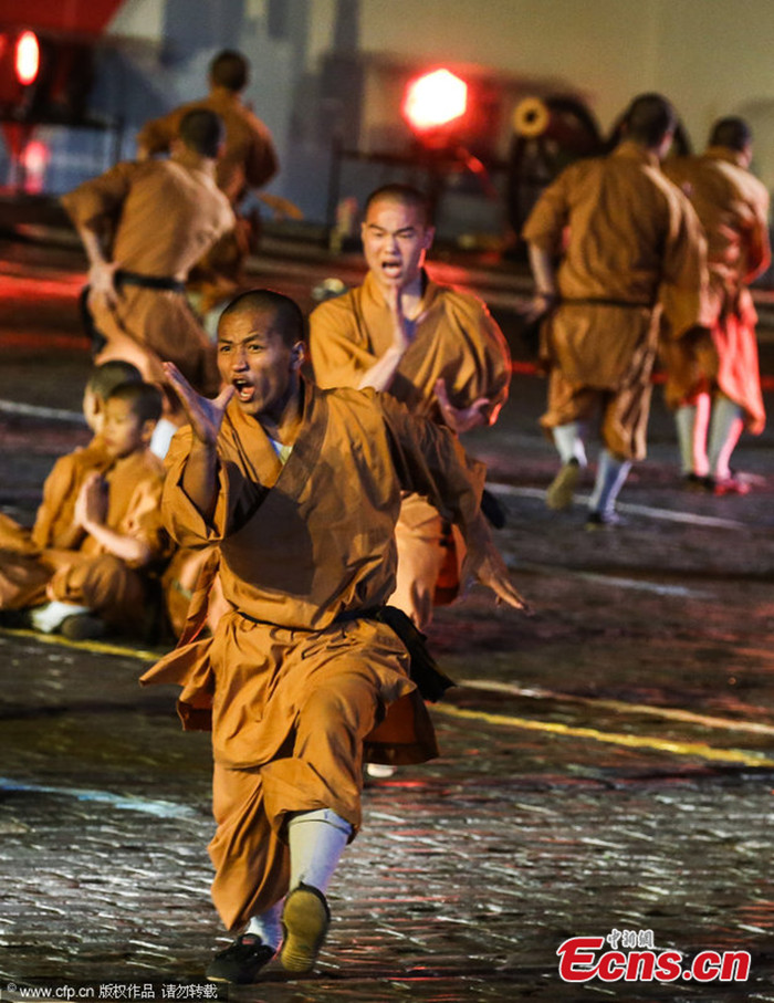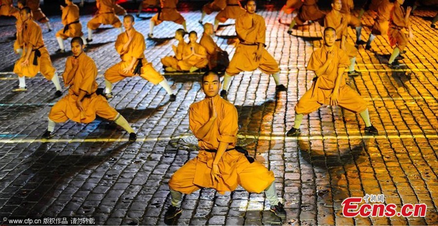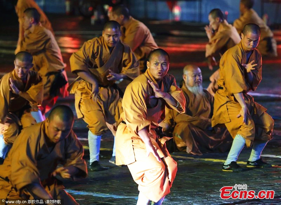 Shaolin monks perform at the International Military Music Festival "Spasskaya Tower", which kicked off on September 1 and will run till September 8 in Moscow. [Photo/CFP]