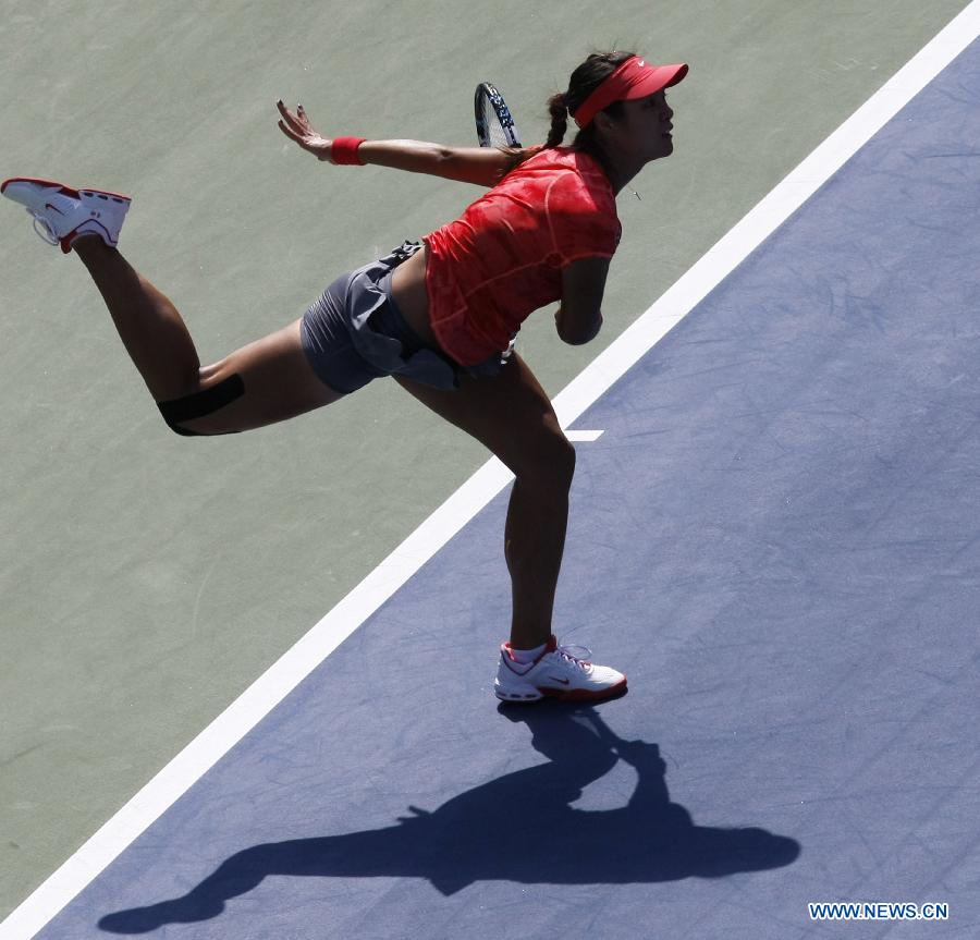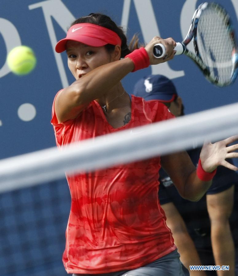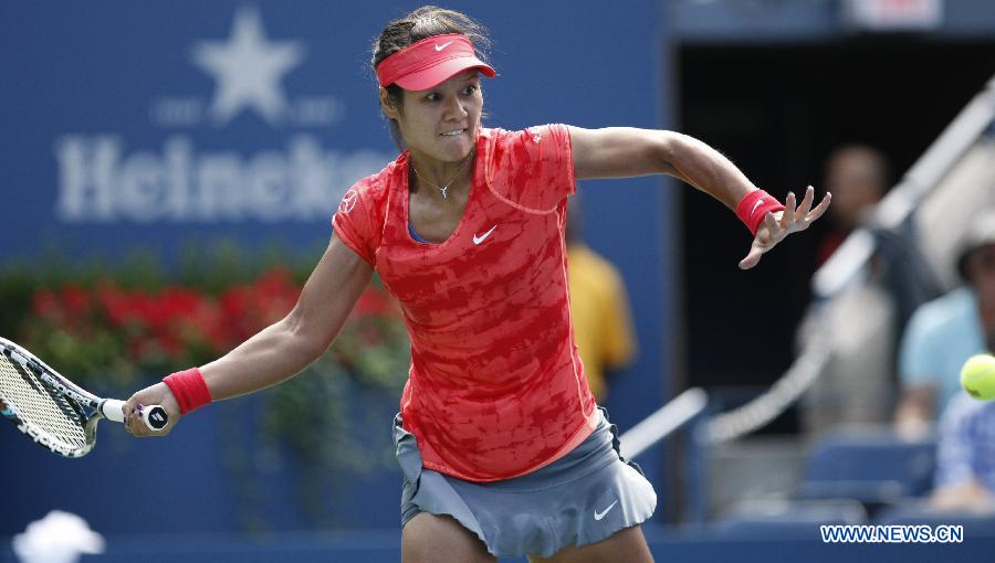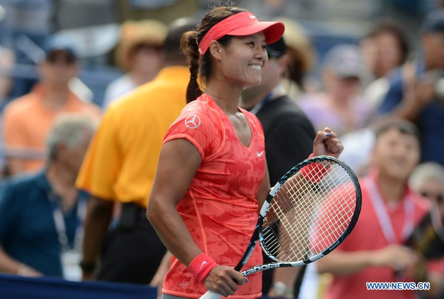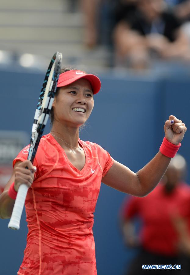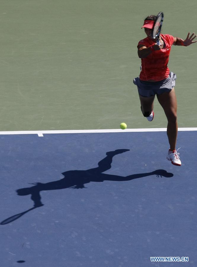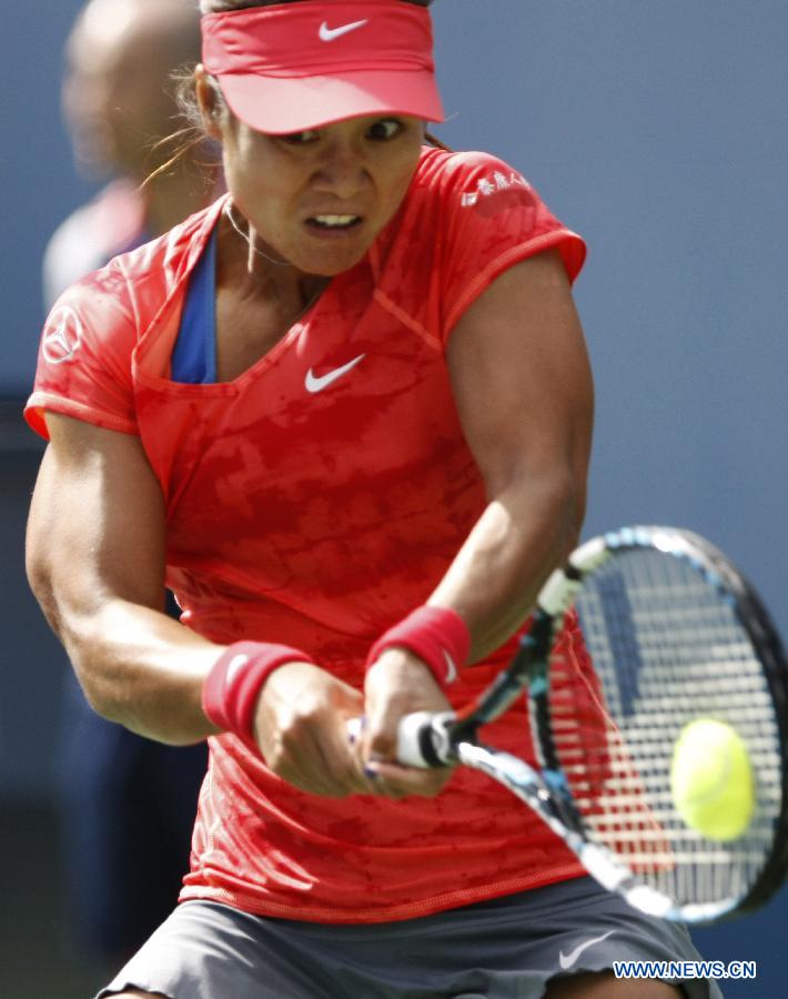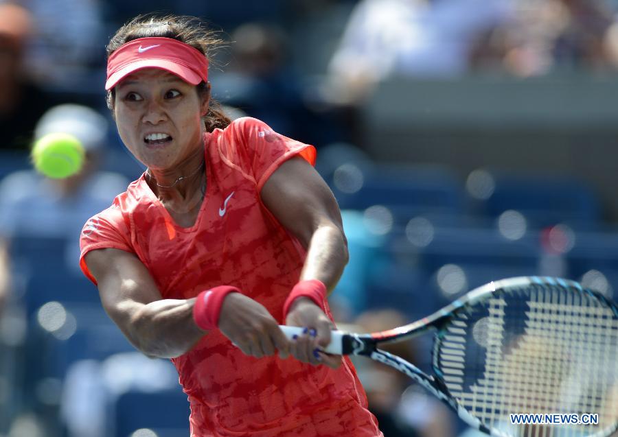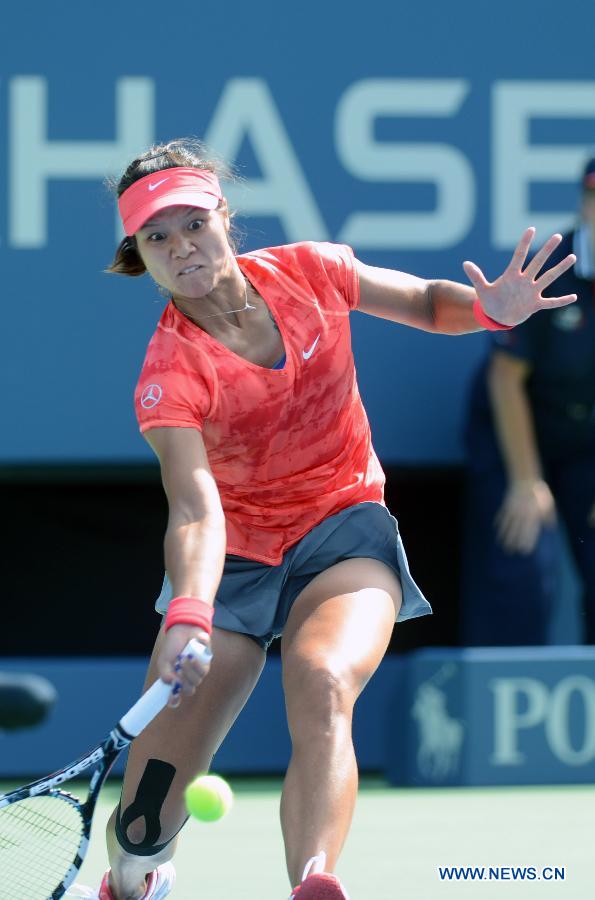 Li Na of China reacts for a return during the women's singles quarterfinal match against Ekaterina Makarova of Russia at the 2013 US Open tennis championships in New York, the United States, on Sept. 3, 2013. Li Na won 2-1 to enter the semifinals. (Xinhua/Fang Zhe)