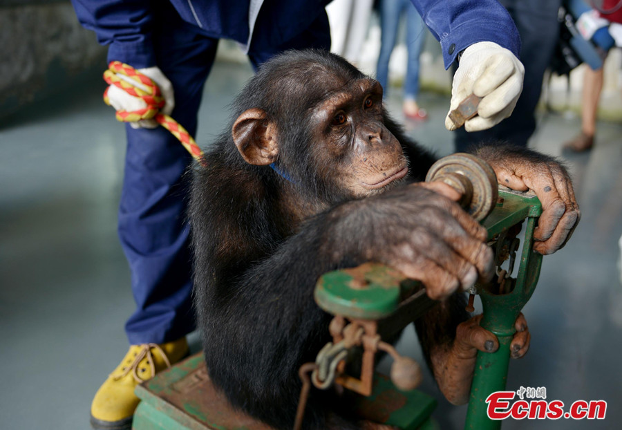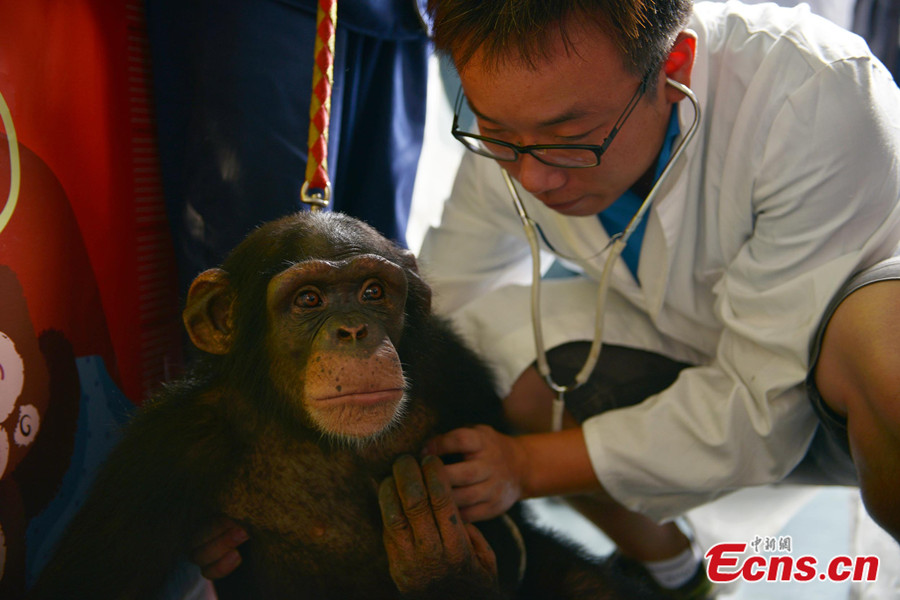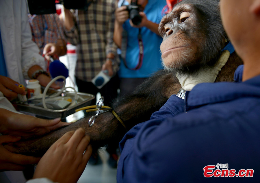 A chimpanzee receives health examination at Wuxi Zoo of east China's Jiangsu province on September 3, 2013. Vets began to carry out health examination on Tuesday for all the animals in the zoo, including chimpanzees, kangaroos and hippos. [Photo: CNS / Li Yifang]
