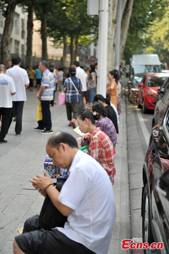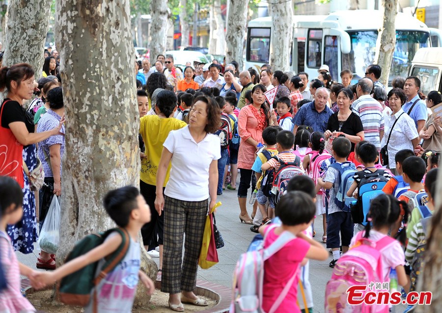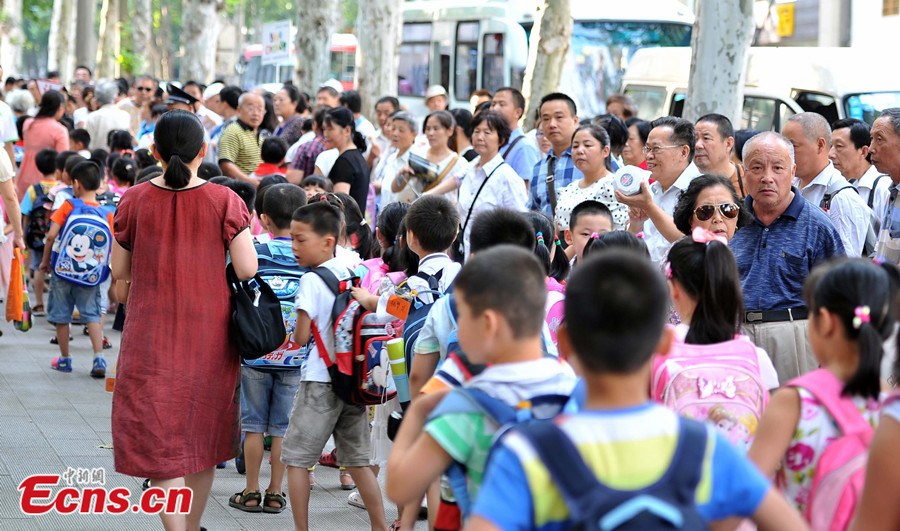 Parents wait to pick up their children at the gate of a primary school in Wuhan, central China's Hubei province on September 3, 2013. When school is over for the day, students in the school line up and walk to "waiting areas", where parents wait to pick them up. [Photo: CNS / Zhang Chang]