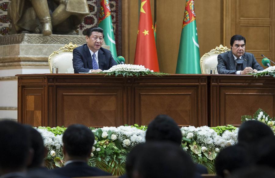 Visiting Chinese President Xi Jinping (L) and his Turkmenian counterpart Gurbanguly Berdymukhamedov attend a joint press conference after their meeting in Ashkhabad, capital of Turkmenistan, Sept. 3, 2013. (Xinhua/Wang Ye)