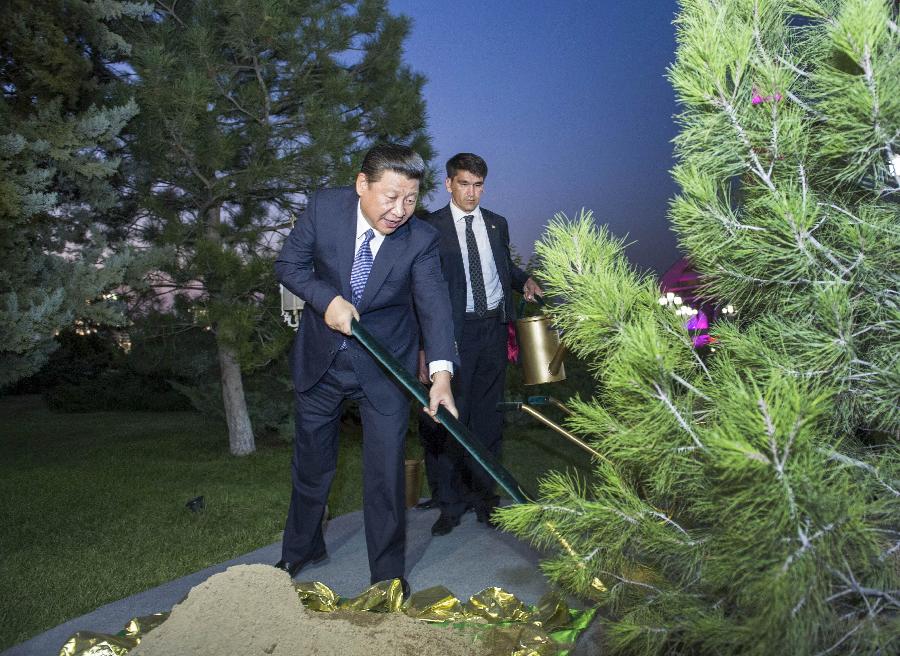 Visiting Chinese President Xi Jinping (front) earths up a firry tree to commemorate the friendship between China and Turkmenistan in Ashkhabad, capital of Turkmenistan, Sept. 3, 2013. (Xinhua/Wang Ye)